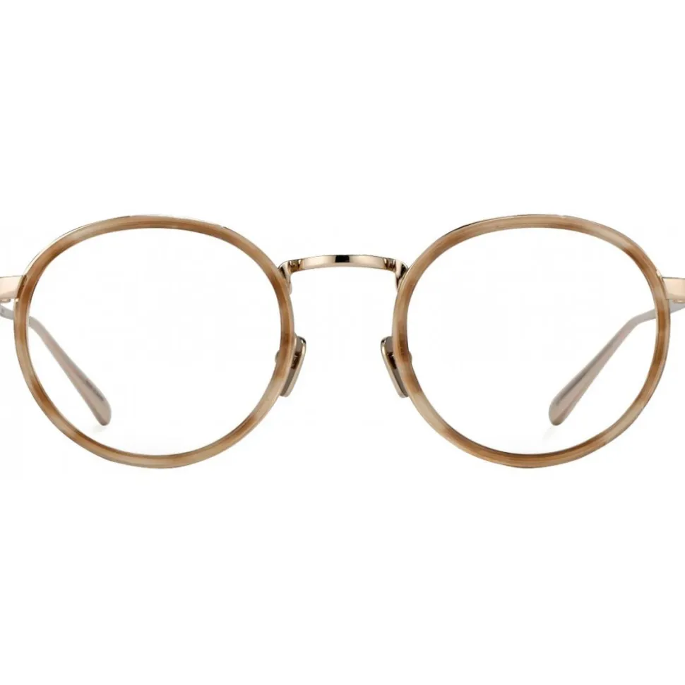 Slim titanium wire frame round glasses, handmade combining luxurious 22 carat gold plated titanium and hand moulded acetate. The lenses are contoured with a slim line of soft acetate, for a defined look, and an angular high wire bridge. The top-frame temples are sleek and simple, and feature sleek temples. The glasses are finished with the ‘Linda Farrow’ logo, printed in signature white on the inverted side of the temple.