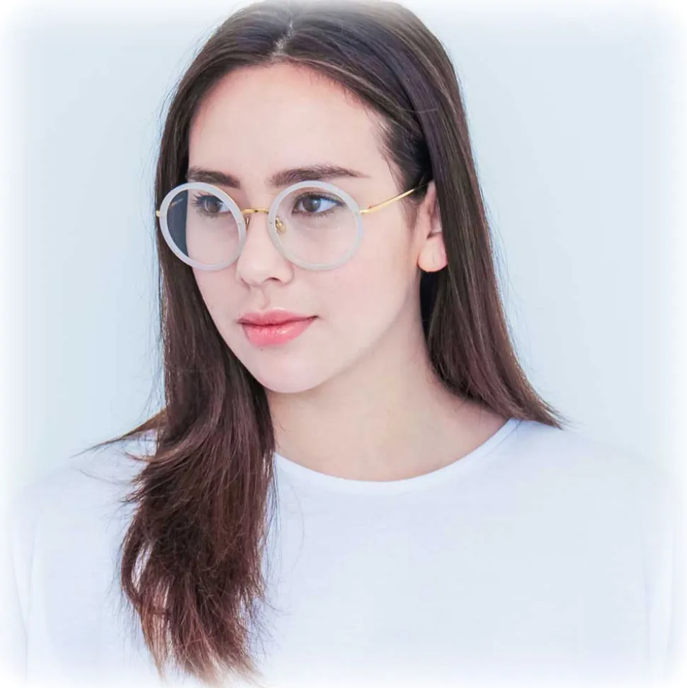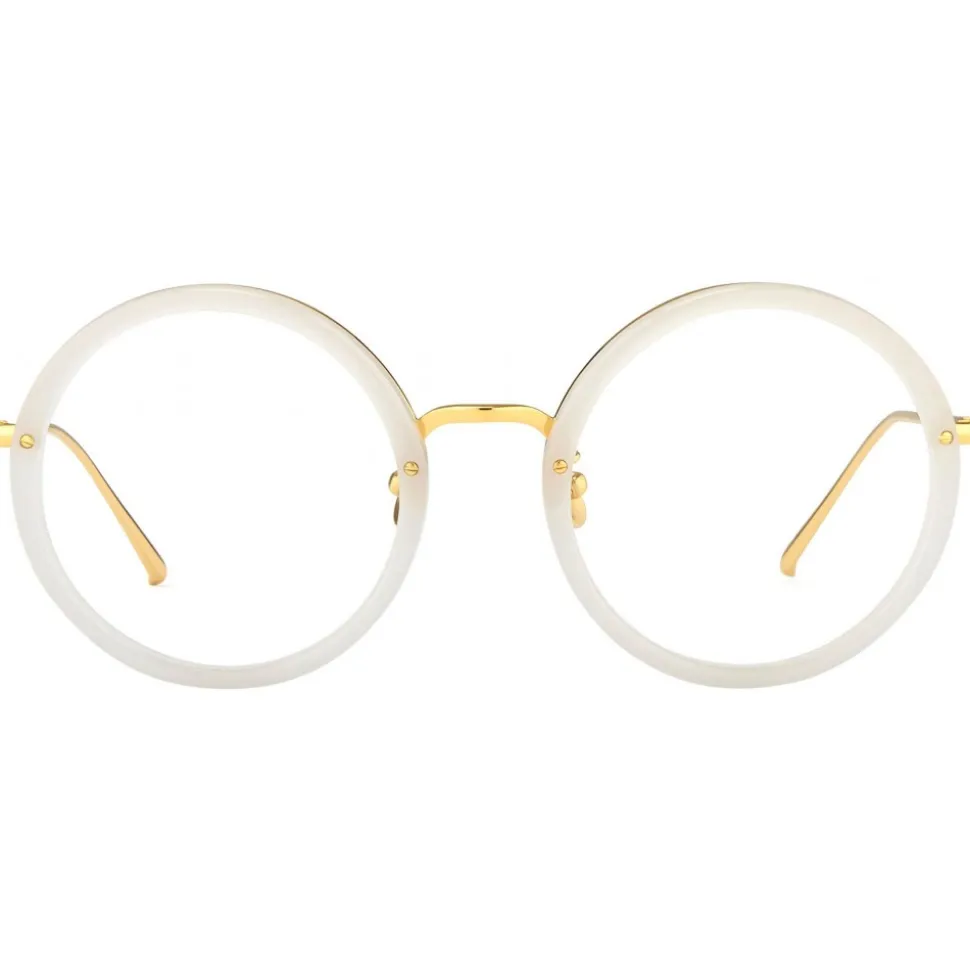 Optical unisex Linda Farrow glasses are handmade from a beautiful combination of 18-22 carat gold-plated titanium and milky grey Japanese acetate frames. Gold-plated lightweight titanium runs along the back of the frame and into the temples for a sophisticated contrast, finished with characteristic curved Japanese bulb tips and adjustable nose pads for added comfort. Signature raised pins and the Linda Farrow logo on the inverted side of the temple complete this timeless design.