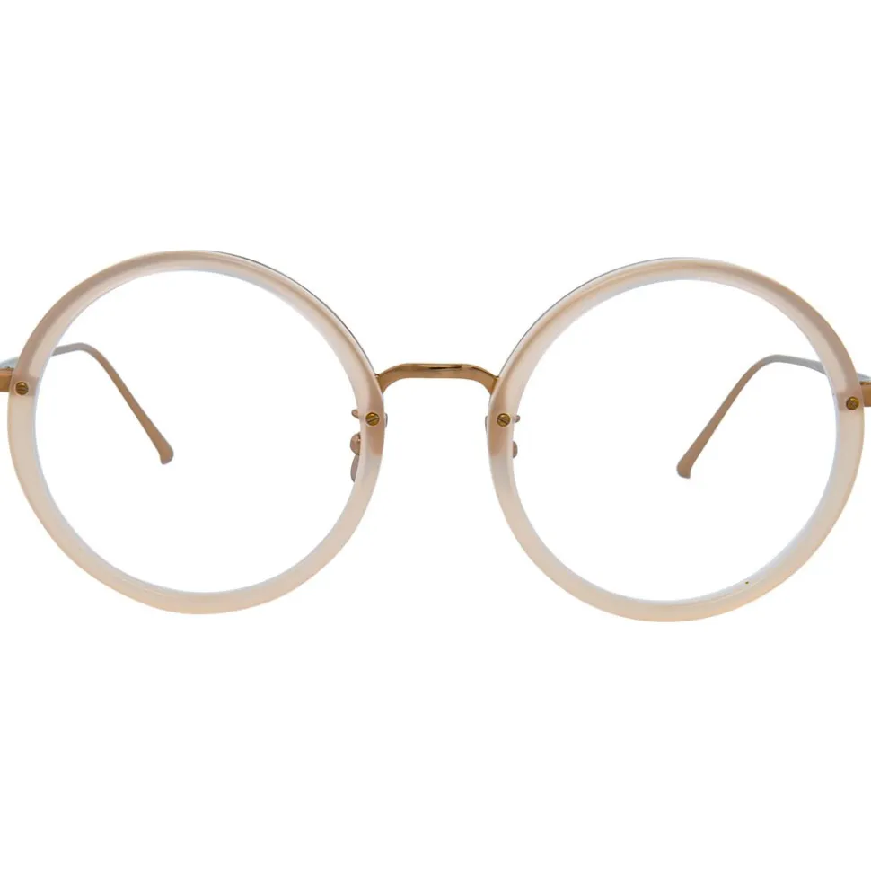 In an oversized round silhouette, these unisex round Linda Farrow optical glasses are the epitome of retro-luxe styling. 18 – 22 carat rose gold-plated lightweight titanium runs along the back top half of the milky peach Italian acetate frame and into slimline temples for a sophisticated contrast, finished with characteristic curved Japanese bulb tips and adjustable nose pads for added comfort. Signature raised pins and the Linda Farrow logo on the inside of the temple complete this timeless design.