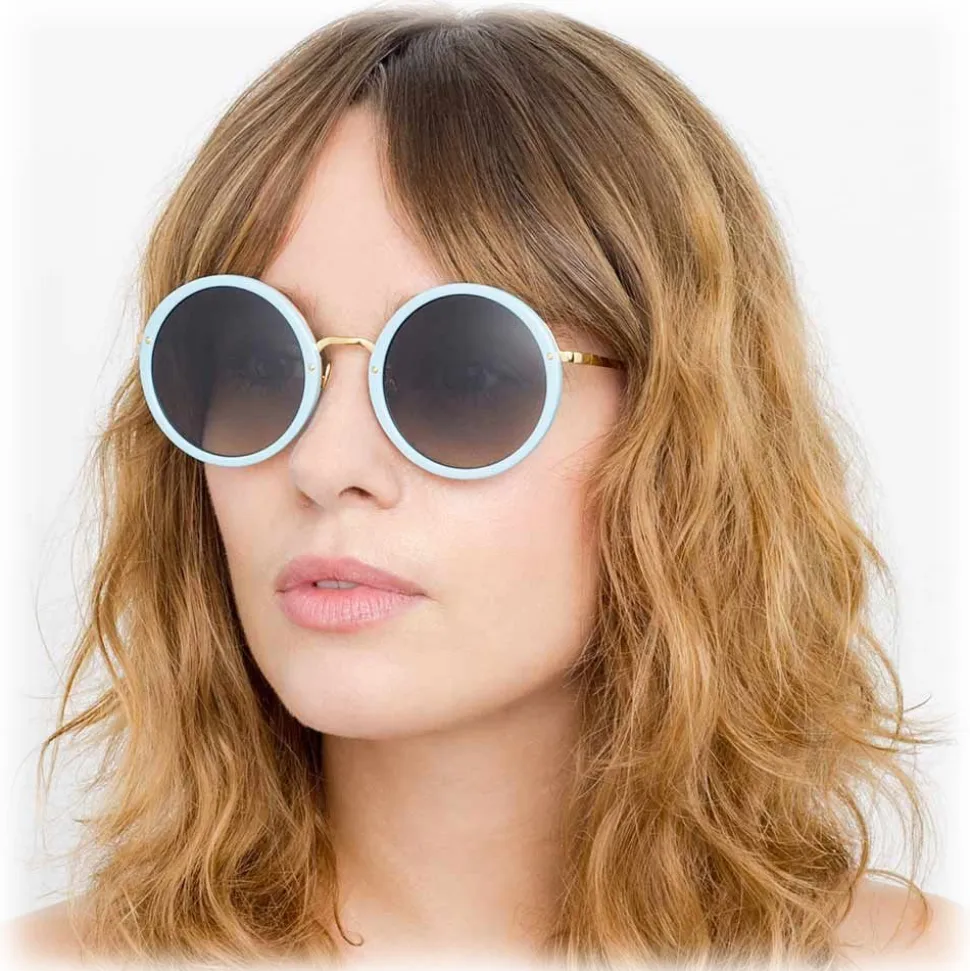 Handmade from a beautiful combination of 18-22 carat yellow gold-plated hypoallergenic titanium and porcelain blue Italian acetate, these unisex round Linda Farrow sunglasses take inspiration from the poolside elegance of the jet set captured by Slim Aarons.
