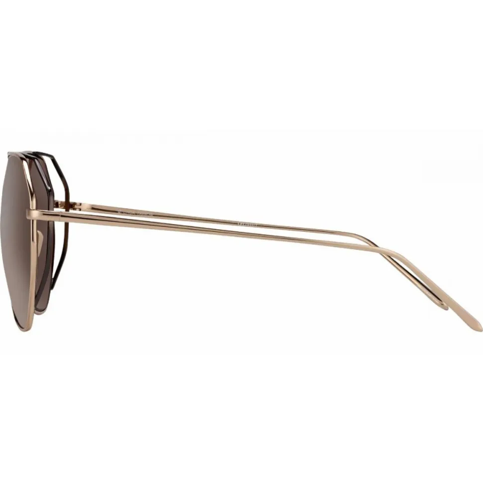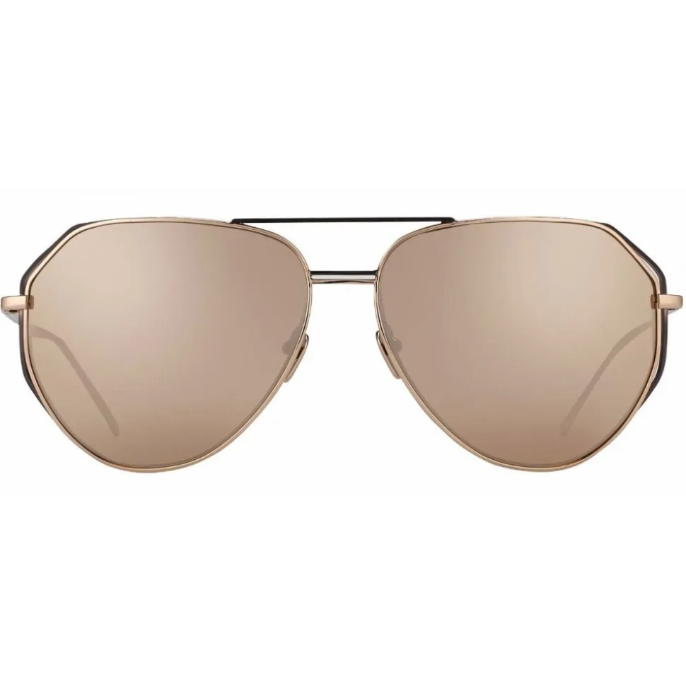 Creating an unexpected twist on a timeless silhouette, these angular oversized aviator sunglasses from Linda Farrow are handmade from 18-22 carat rose gold-plated lightweight titanium. A nickel and gold-plated double nose bridge and wire frame creates an unusual floating effect between the rims, which contour the rose gold precious lenses.