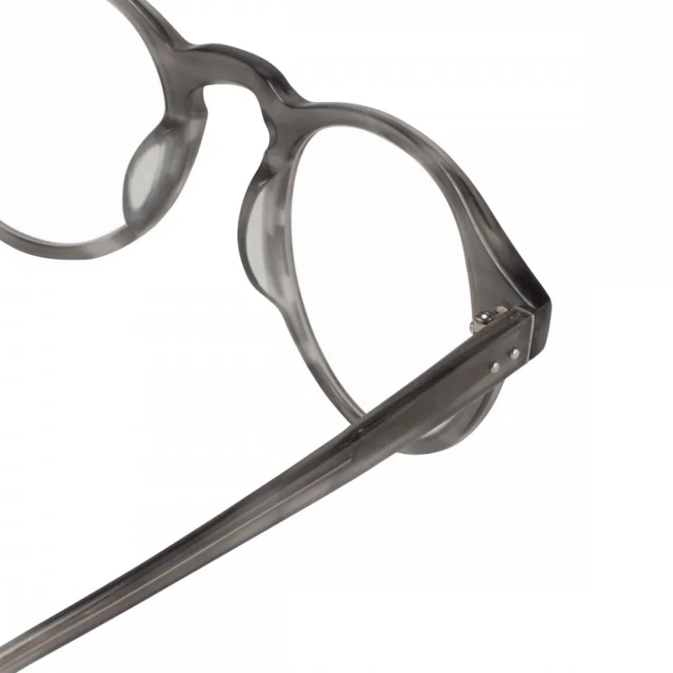 Updating classic silhouettes with unexpected details, these oval unisex Linda Farrow optical glasses are grey Italian acetate to create a defined silhouette around the eye, with signature Japanese titanium running through the temples. Complete with Japanese bulb tips for superior comfort, this imitable style is finished with signature gold raised pin details and Linda Farrow logo on the inverted side of the temple.