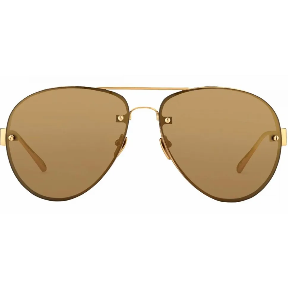 Handcrafted from 18-22 carat gold-plated lightweight titanium, these unisex Linda Farrow aviator sunglasses are the epitome of modern luxury. With a double nose bridge and thick frames which contour the matt gold lenses, these aviator sunglasses are detailed with signature raised pins, smooth tapered temples with Japanese bulb tips and adjustable nose pad for superior comfort.