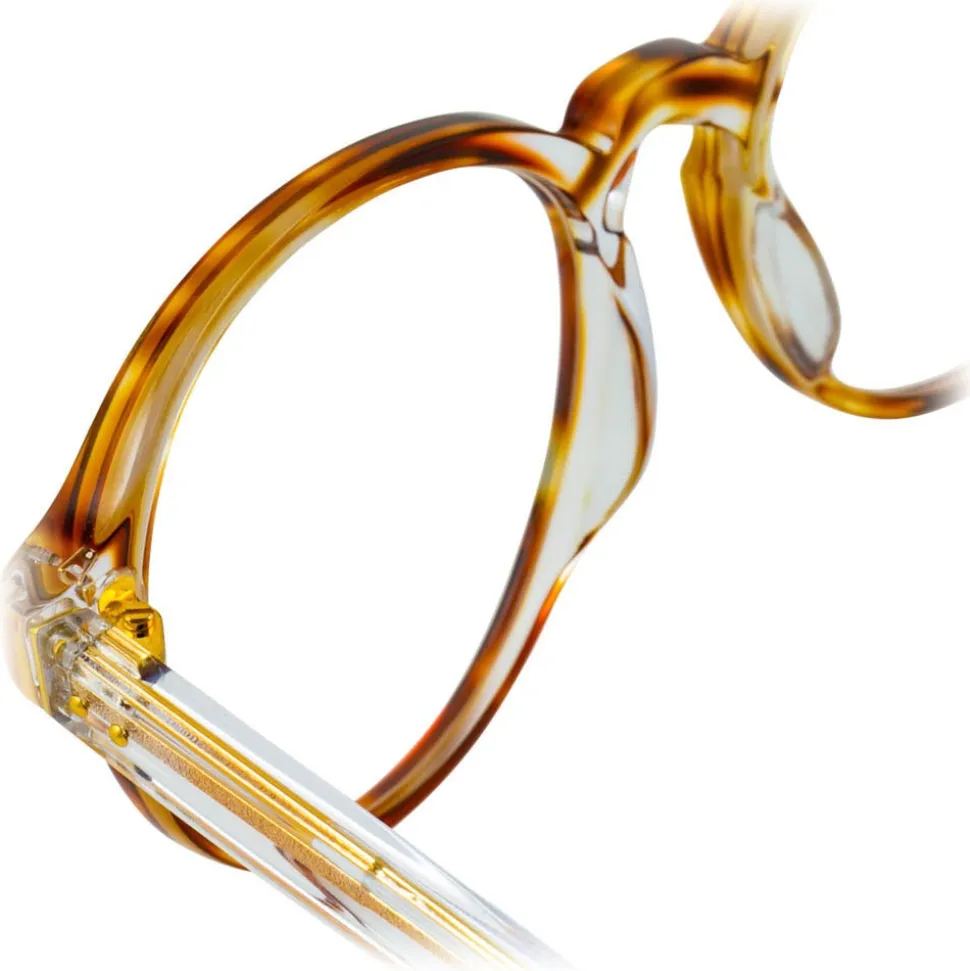Updating classic silhouettes with unexpected details, these oval unisex Linda Farrow optical glasses pair clear and tortoiseshell Italian acetate to create a defined silhouette around the eye, with contrasting 18 – 22 yellow carat gold-plated titanium running through the temples. Complete with Japanese bulb tips for superior comfort, this imitable style is finished with signature gold raised pin details and gold foil Linda Farrow logo on the inverted side of the temple.