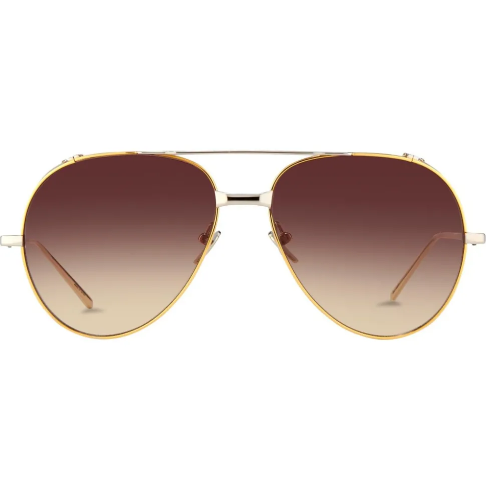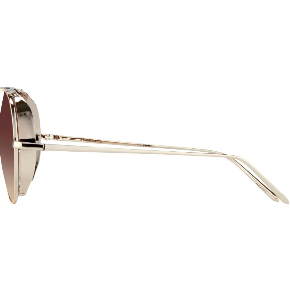 Luxurious Linda Farrow aviator sunglasses handcrafted purely from 18-22 carat white gold-plated lightweight titanium. With brown gradient nylon lenses framed with contrasting yellow gold, these timeless sunglasses are instantly recognisable by their statement white gold blinkers and are finished with a double nose bridge of contrasting widths and signature pointed temples, attached at mid-frame.