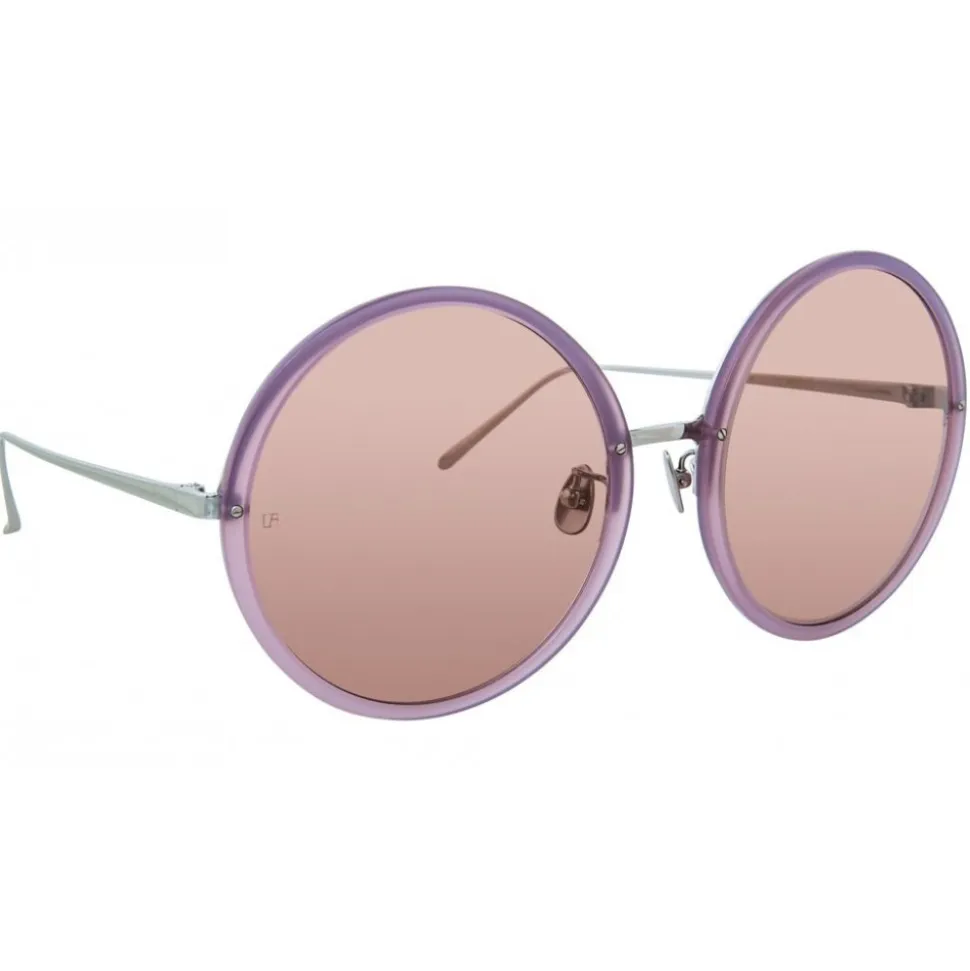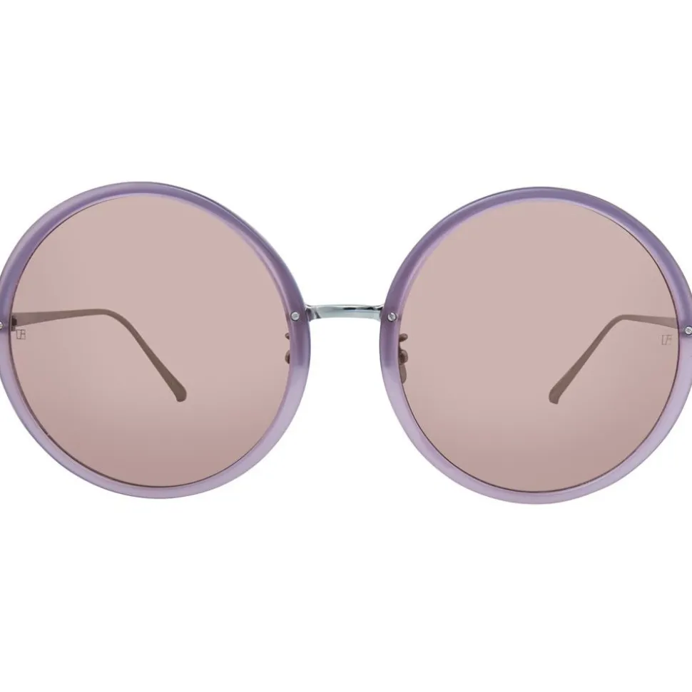 The epitome of elegance, these Linda Farrow round sunglasses are handcrafted from Italian acetate in milky purple, with metal running behind the framework for added strength. With purple nylon lenses, these sunglasses are accented with contrasting 18 – 22 carat white gold-plated slim titanium temples, finished with signature raised pin details.