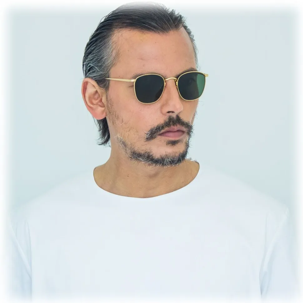 Handcrafted entirely from 18-22 carat gold-plated Japanese titanium, these Linda Farrow square browline sunglasses are the epitome of modern luxury. With contrasting solid green lenses, the sleek, lightweight temples are attached at the top of the frames.