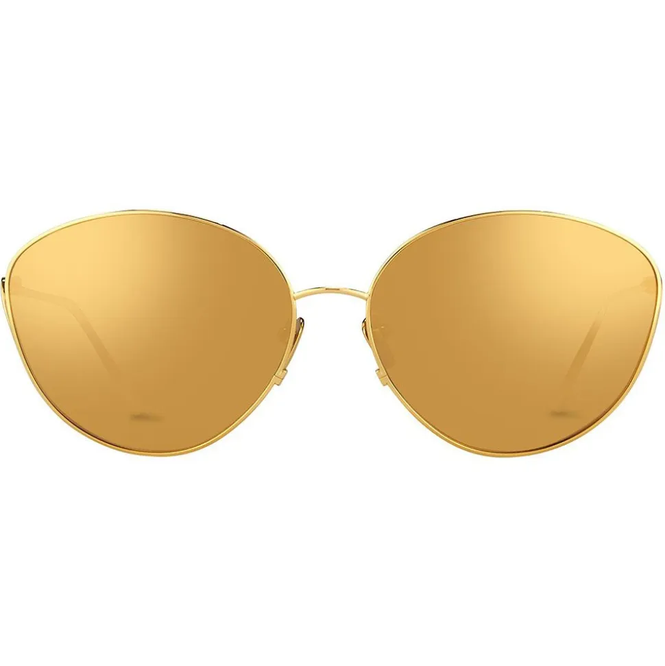 Elegant Linda Farrow cat eye sunglasses crafted by hand from 18-22 carat gold-plated Japanese titanium. With co-ordinating gold precious lenses, these sunglasses feature slim temples for a sleek finish, attached at the bottom of the frame to create negative space at the top of the frame between the temples and rims.