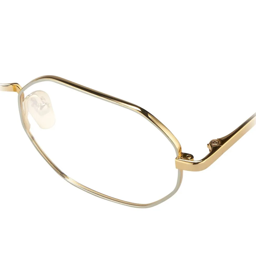 Fusing directional design with unparalleled hand-craftsmanship, these unisex angular Linda Farrow optical glasses are made from 18-22 carat gold-plated Japanese titanium. Rims in white gold are contrasted with a yellow gold nose bridge and slim temples, complete with Japanese bulb tips and adjustable nose pads for superior comfort. This style is finished with the Linda Farrow logo in white on the inverted side of the temple.