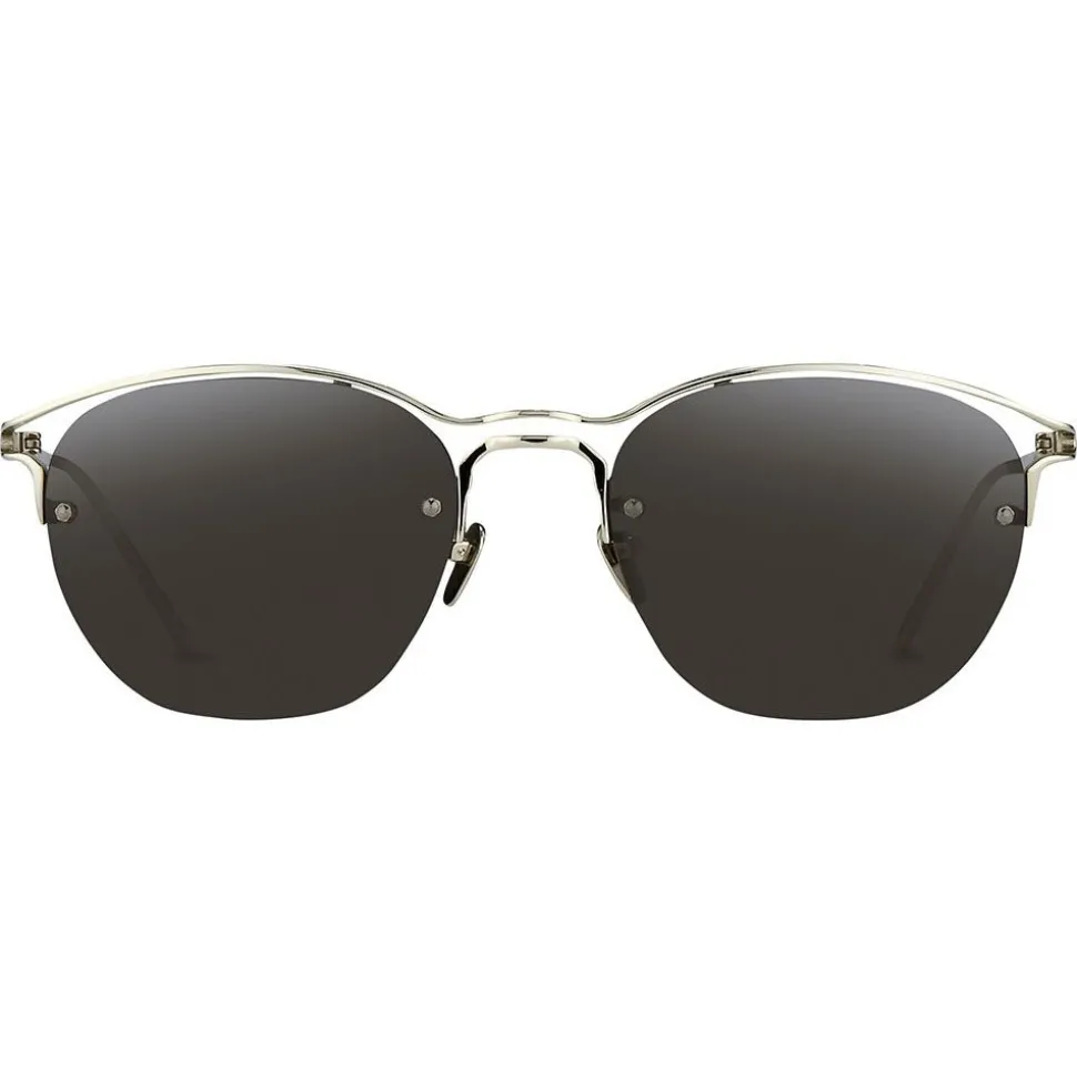 Handcrafted from 18-22 carat white gold-plated Japanese titanium, these Linda Farrow browline sunglasses are the epitome of sophistication. With contrasting solid grey nylon lenses, these sunglasses feature an innovative outlined top frame which creates a floating lenses effect.