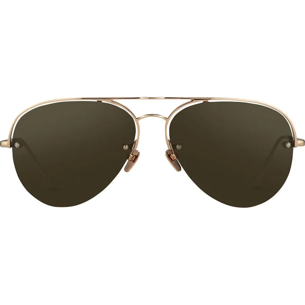 Luxurious aviator sunglasses from Linda Farrow featuring solid brown nylon lenses, contoured by a thin 18-22 carat rose gold-plated Japanese titanium top bar, inner rim and nose bridge that creates a floating effect. Streamlined, co-ordinating slim temples are tapered with Japanese bulb tips and adjustable nose pads provide superior levels of comfort, with the Linda Farrow logo in signature white inset in the inverted side of the temple.