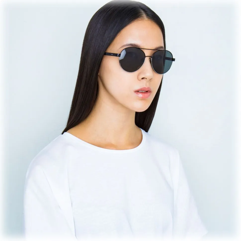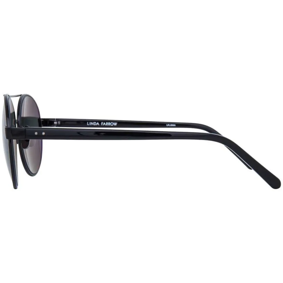 Crafted with 18-22 carat white gold plated elements, these Linda Farrow unisex sunglasses are the epitome of modern luxury. In a round aviator silhouette, hypoallergenic and lightweight black to 18-22 white gold carat plated Japanese titanium frames are contrasted with grey solid nylon lenses and black acetate temples, complete with characteristic raised pin details.