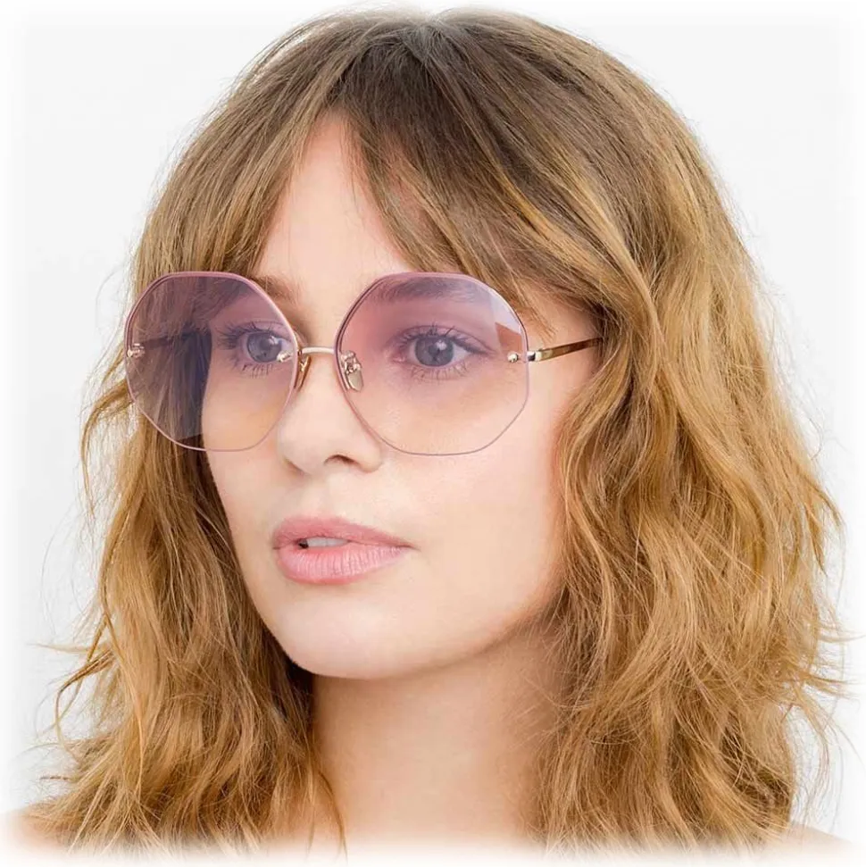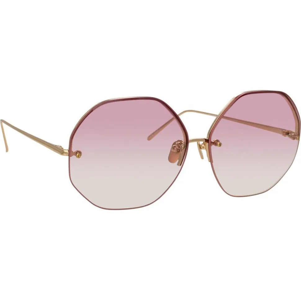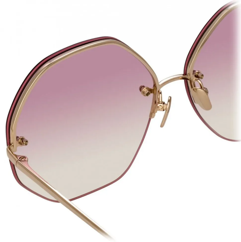 In an oversized angular silhouette, these luxurious Linda Farrow sunglasses celebrate the era of the good life captured by Slim Aarons. Handcrafted with 18-22 carat light gold-plated hypoallergenic titanium running along the top half of the back of the frame and into tapered temples, these statement sunglasses are contrasted with pink gradient nylon lenses.