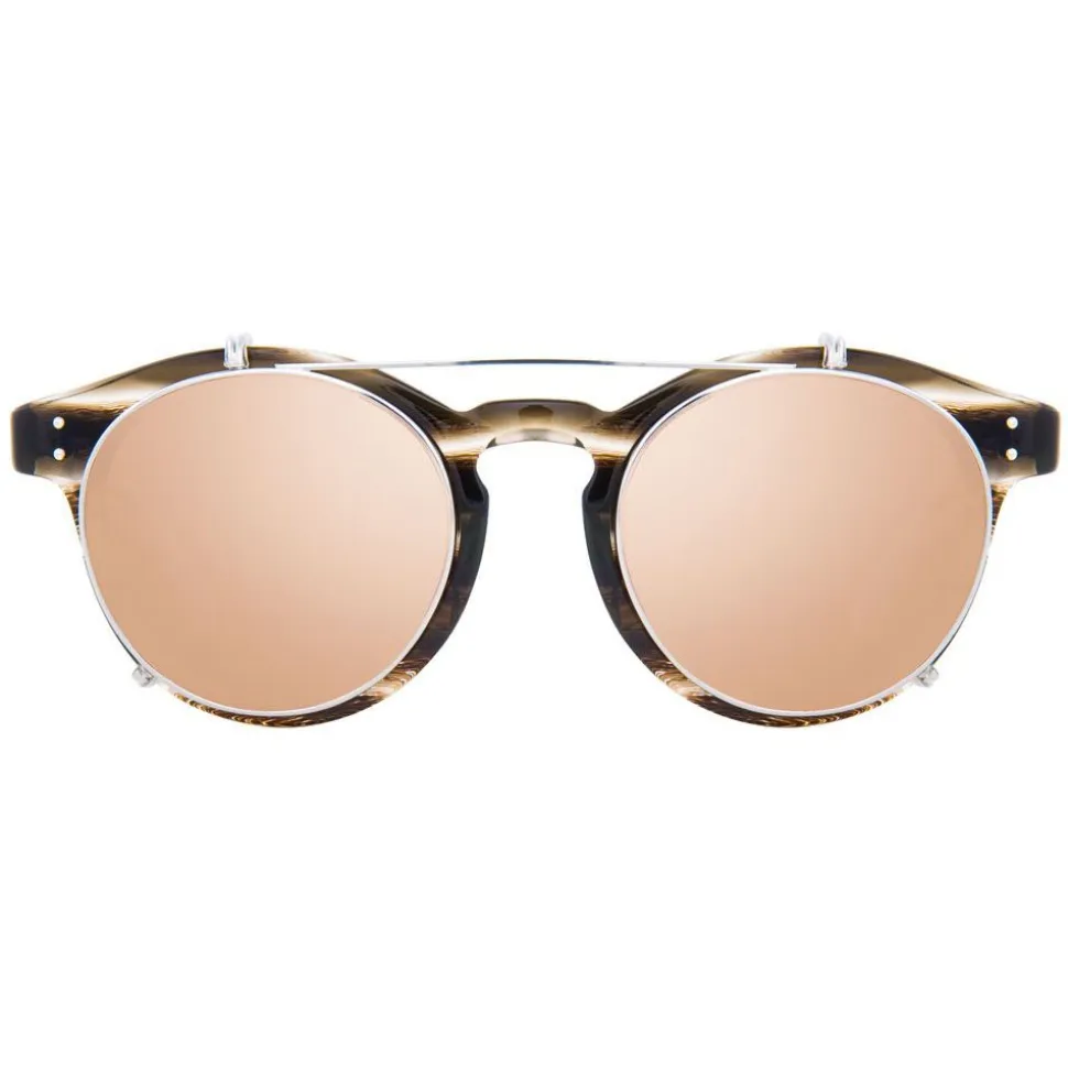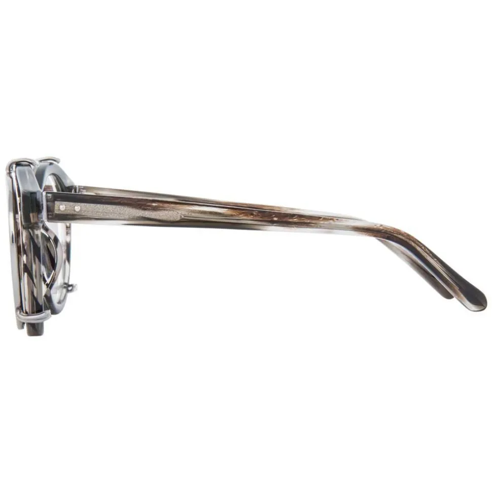 Elevating optical glasses with an innovative clip-on sunglasses feature, these rounded keyhole glasses are the epitome of modern luxury. Flat rose gold precious lenses with contrasting 18-22 carat white gold plated rims, titanium top bar and clips attach to hand polished grey horn Italian acetate frames.