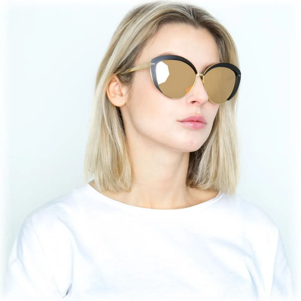 In a retro-inspired cat eye silhouette, these luxurious sunglasses encapsulate the hallmarks of the Linda Farrow aesthetic. Winged black aluminium frames contour gold precious lenses, creating a striking contrast with co-ordinating slim temples and a curved nose bridge crafted from 18-22 carat yellow gold-plated lightweight titanium.