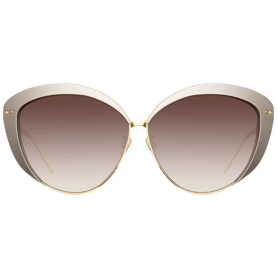 In a retro-inspired cat eye silhouette, these luxurious sunglasses encapsulate the hallmarks of the Linda Farrow aesthetic. Winged taupe aluminium frames contour brown gradient nylon lenses, creating a striking contrast to slim temples and a curved nose bridge crafted from 18-22 carat yellow gold-plated lightweight titanium.