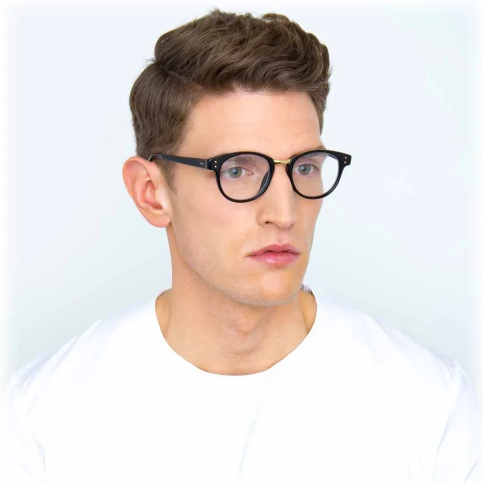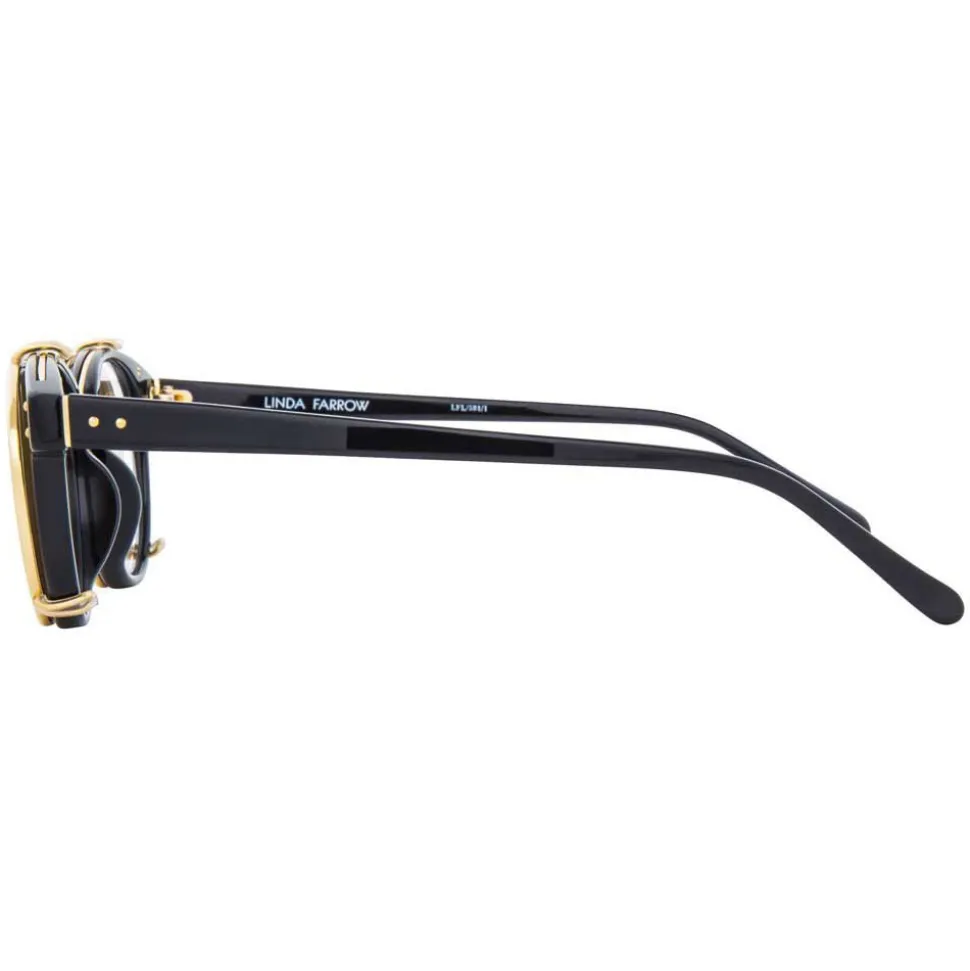 Reinventing the browline silhouette, these unique Linda Farrow optical glasses are easily transformed with an innovative clip-on flat sunglasses feature. Flat gold precious lenses are outlined with 18-22 carat gold plated titanium top bar and clips attach to hand polished black Italian acetate frames.
