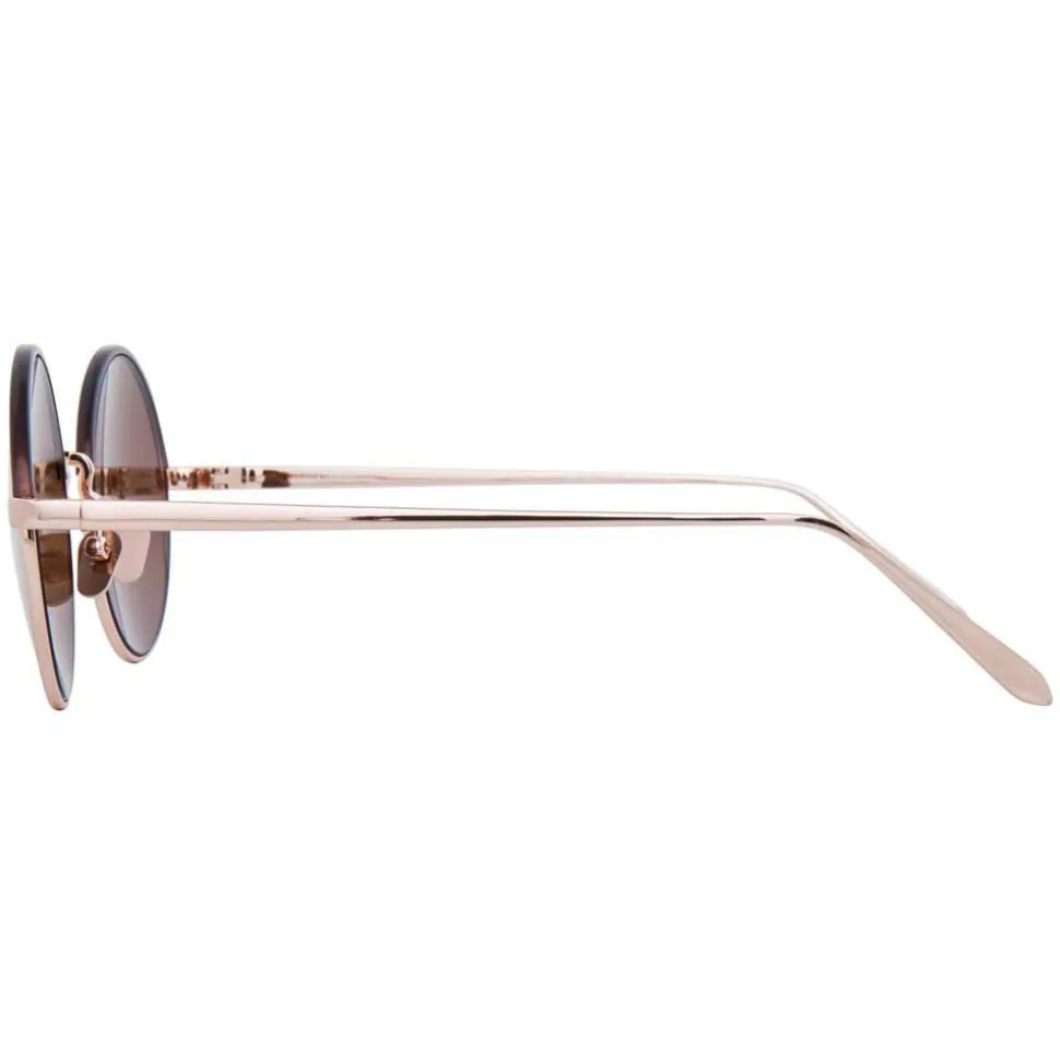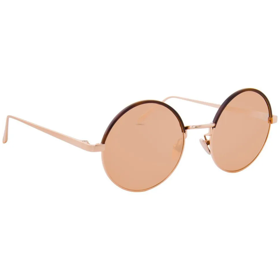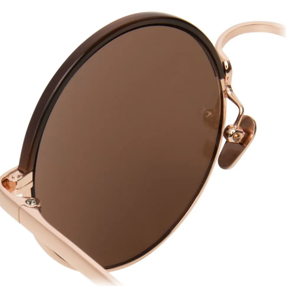 Smooth and sleek, these luxurious unisex round Linda Farrow sunglasses are handcrafted with rose gold precious lenses and 18-22 carat rose gold plated titanium frames, contoured with a mocha Italian acetate half Windsor rim.