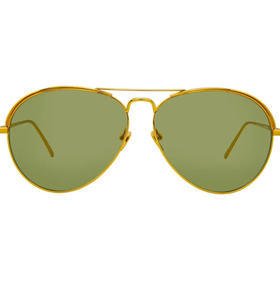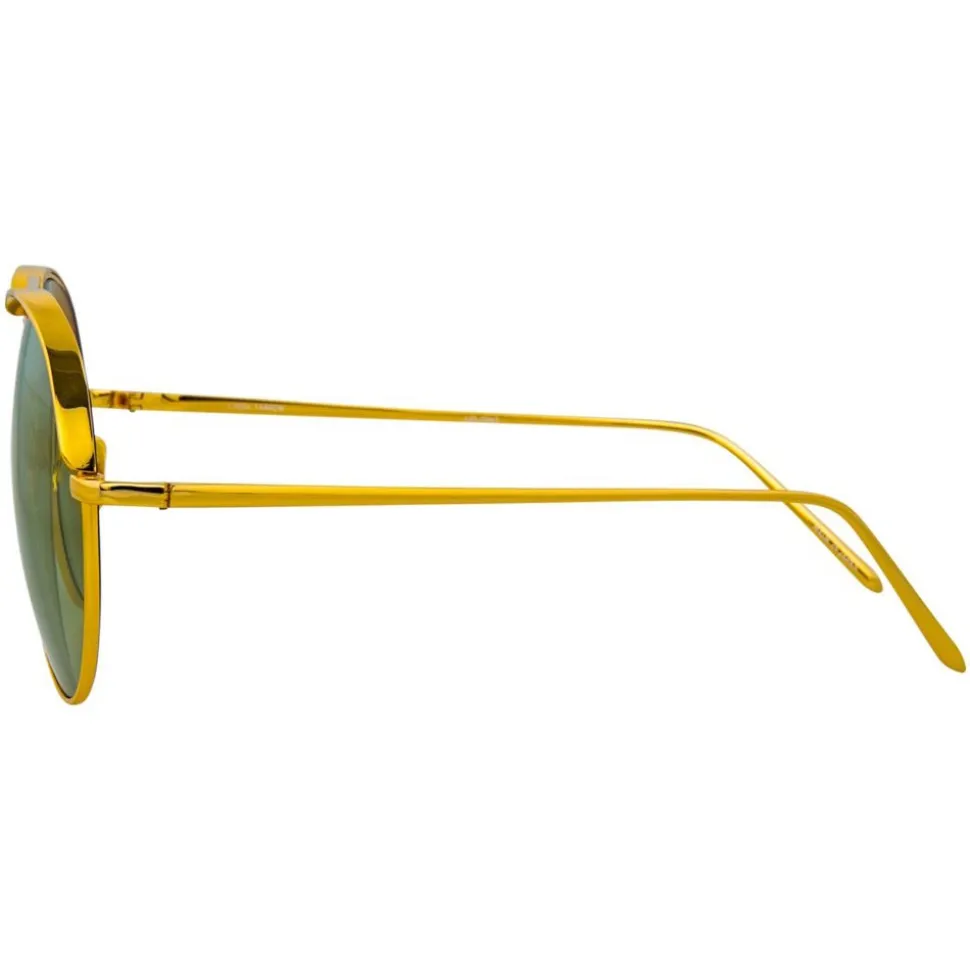 Bringing understated yet luxurious details to the timeless aviator silhouette, these unisex Linda Farrow sunglasses are handcrafted entirely from 18 – 22 carat yellow gold-plated Japanese lightweight titanium. With contrasting light green lenses, this key style is elevated with subtle lip capping to the top of the lens and a raised feature nose bridge, with signature finishes including tapered temples with Japanese bulb tips and the Linda Farrow logo printed in white on the inside of the temple.