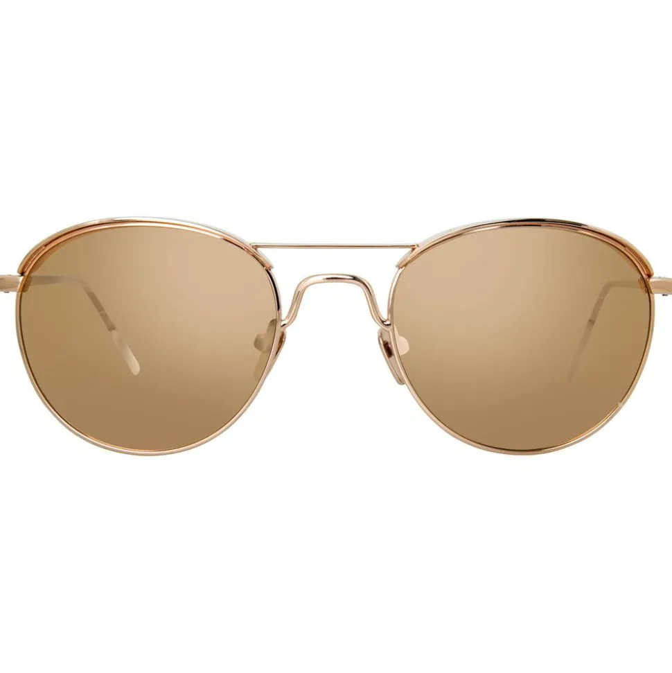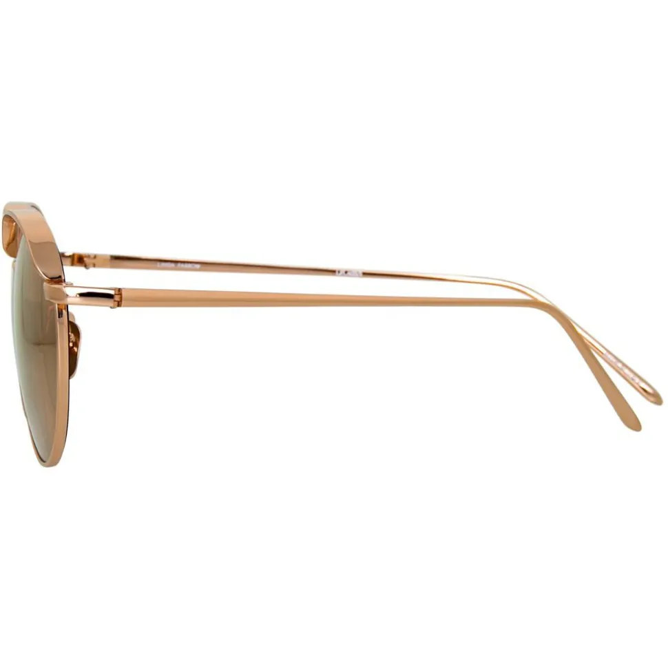 A luxurious update on a timeless silhouette, these men’s oval Linda Farrow sunglasses are handcrafted entirely from 18 – 22 carat rose gold-plated Japanese lightweight titanium. Paired with co-ordinating precious rose gold lenses, this key style is elevated with subtle lip capping to the top of the lens, a raised feature nose bridge and contrasting flat top bar, with signature finishes including tapered temples with Japanese bulb tips and the Linda Farrow logo printed in white on the inside of the temple.