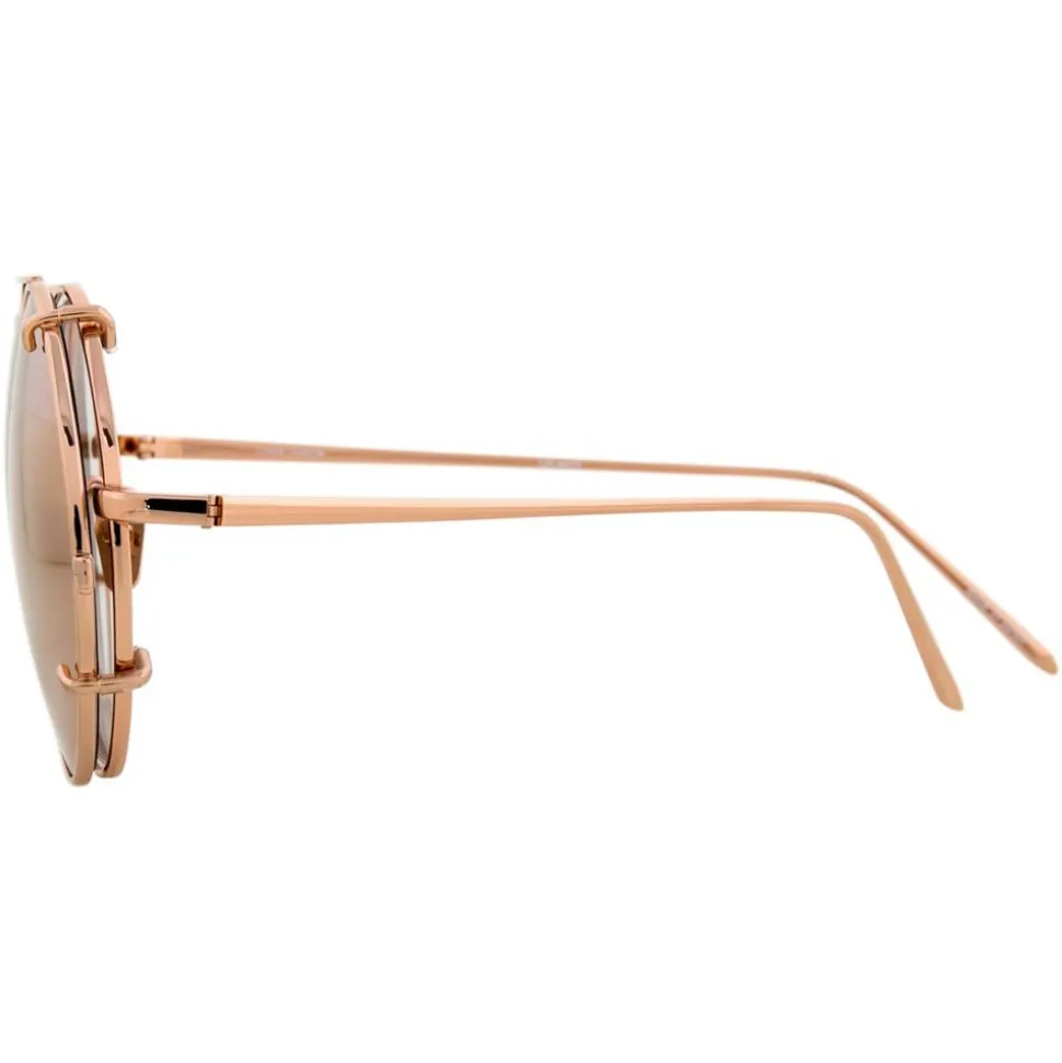 Handcrafted entirely from 18-22 carat rose gold-plated titanium with co-ordinating rose gold precious lenses, these sunglasses feature a curved nose bridge with a top bar that clips on to co-ordinating frames.