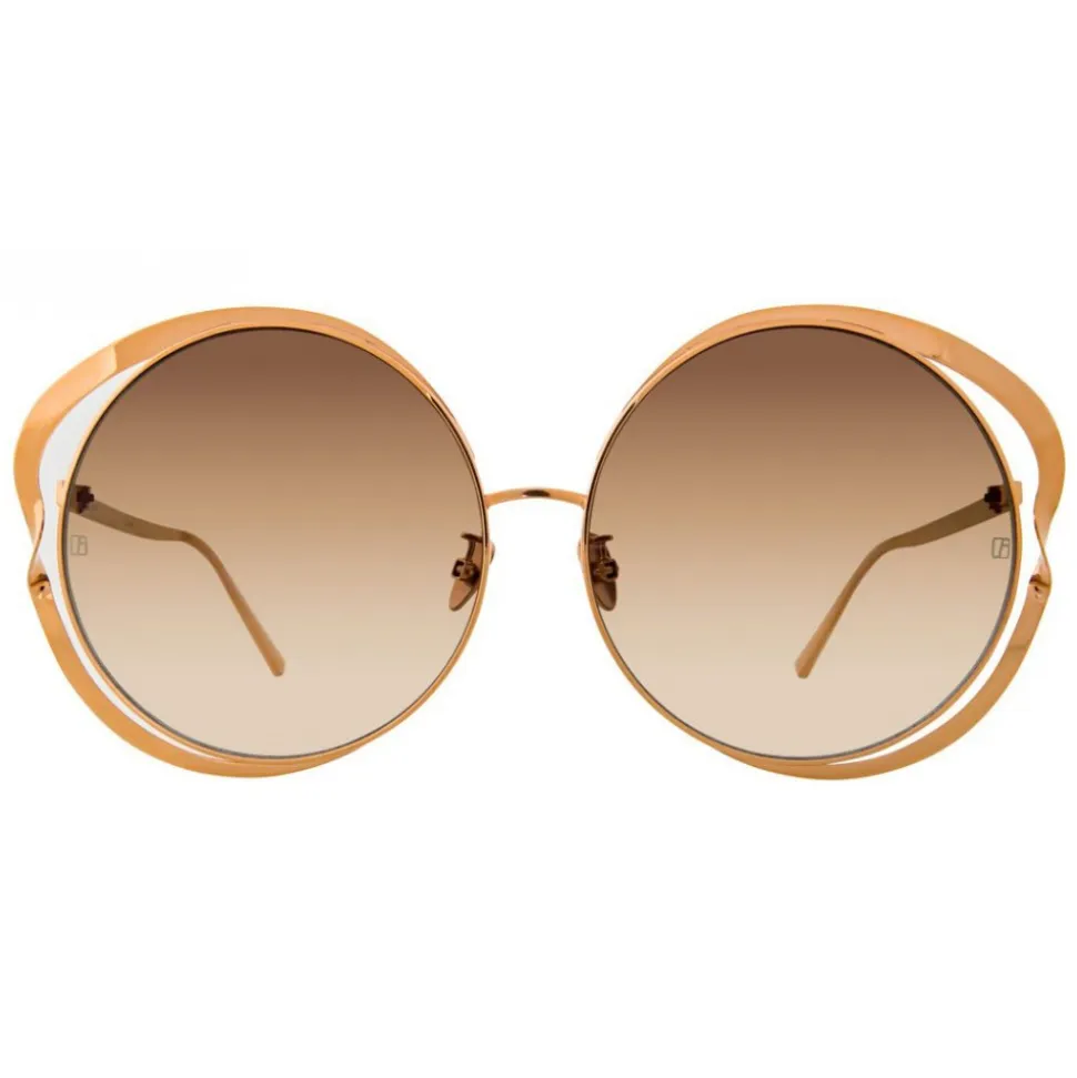 Key to the Linda Farrow collection, these oversized round ‘Aimee’ Linda Farrow sunglasses will instantly make a glamorous statement. Crafted entirely from 18 – 22 carat rose gold-plated titanium, these special sunglasses feature brown gradient nylon lenses with a delicate twisted ribbon which creates a hyper feminine silhouette that mirrors the frames and showcases superior craftsmanship.