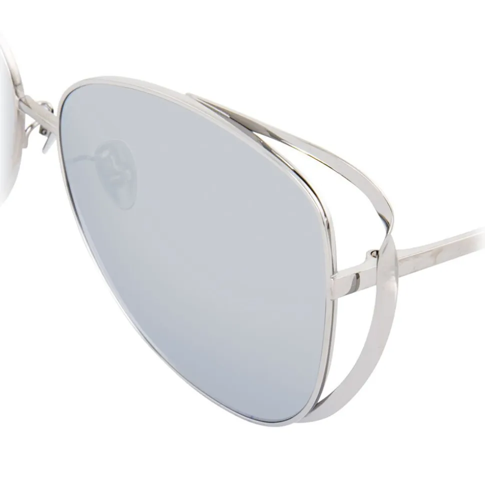 Championing the hallmarks of luxury and glamour, these cat eye ‘Rosarda’ sunglasses from Linda Farrow will instantly elevate your look. Crafted entirely from 18 – 22 carat white gold-plated titanium, these special sunglasses feature platinum precious lenses with a delicate twisted ribbon which creates a hyper feminine silhouette, mirroring the frames and showcasing superior craftsmanship.