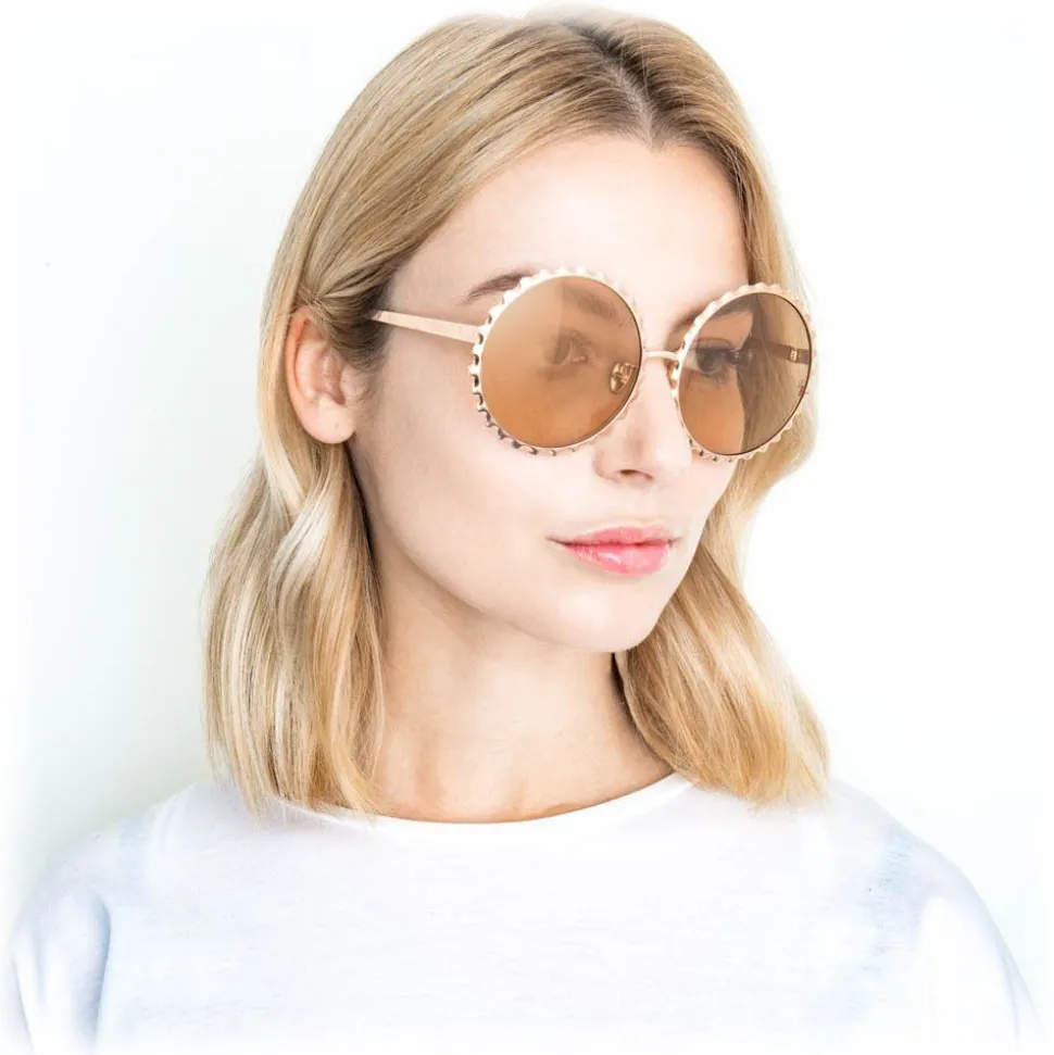 Channeling vintage silhouettes with whimsical details, these super statement sunglasses from Linda Farrow are created entirely from 18 – 22 carat rose gold-plated titanium, which is custom cast to create the special scalloped edges around the frame.