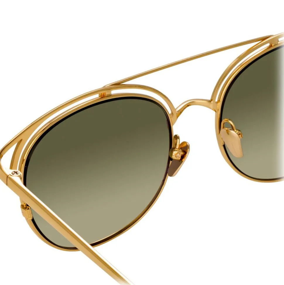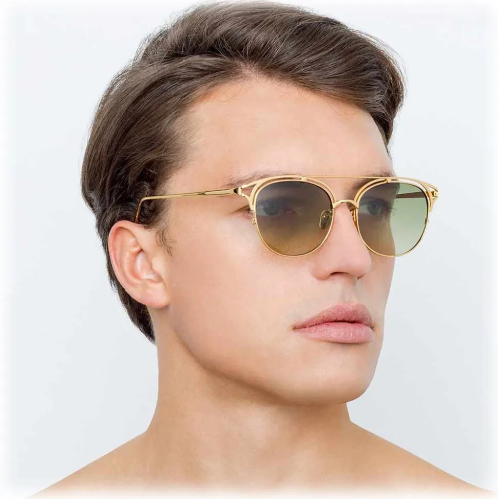 Drawing influence from the glamour of the jet set society captured by photographer Slim Aarons, these luxurious men’s Linda Farrow oval sunglasses are crafted entirely from 18-22 carat yellow gold-plated hypoallergenic lightweight titanium with co-ordinating green gradient nylon lenses and finished by hand.