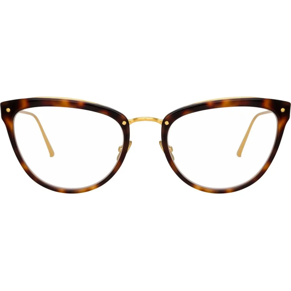 Encapsulating the vintage glamour of the jet set captured in Slim Aarons’ photographs, these winged cat-eye Linda Farrow optical glasses are the epitome of retro-luxe styling. 18 – 22 carat yellow gold-plated lightweight titanium runs along the back of the tortoiseshell Italian acetate frame and into the nose bridge and temples for a sophisticated contrast. Signature raised pins, tapered temples detailed with the Linda Farrow logo and adjustable nose pads for added comfort complete these glasses.