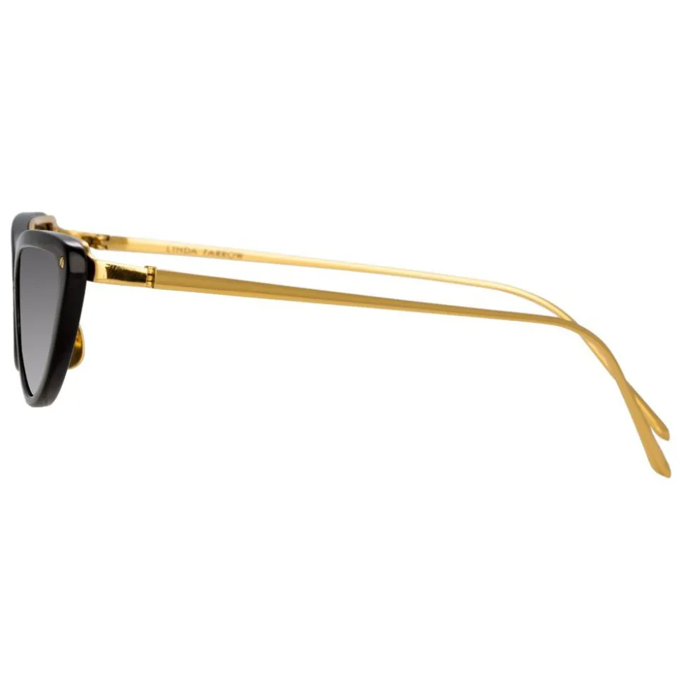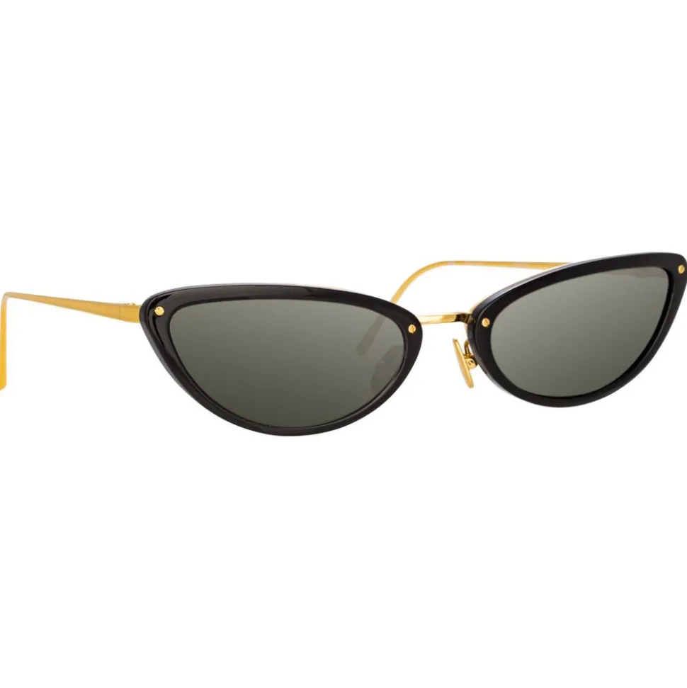 In an ultra skinny cat eye silhouette that pays homage to 90s nostalgia, these Linda Farrow sunglasses will make a bold statement. Black Italian acetate is paired with dark grey nylon lenses and 18-22 carat yellow gold-plated hypoallergenic titanium which runs across the top half of the back of the frame into lightweight, tapered temples.