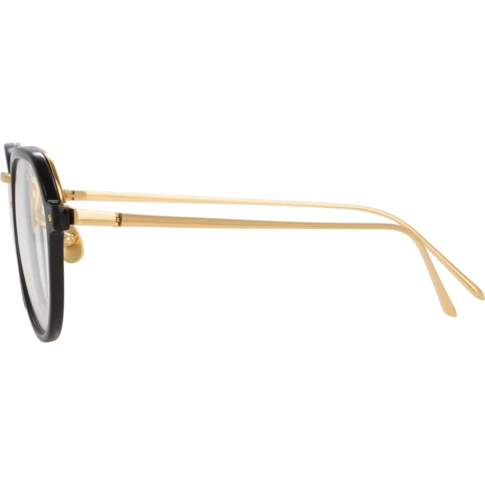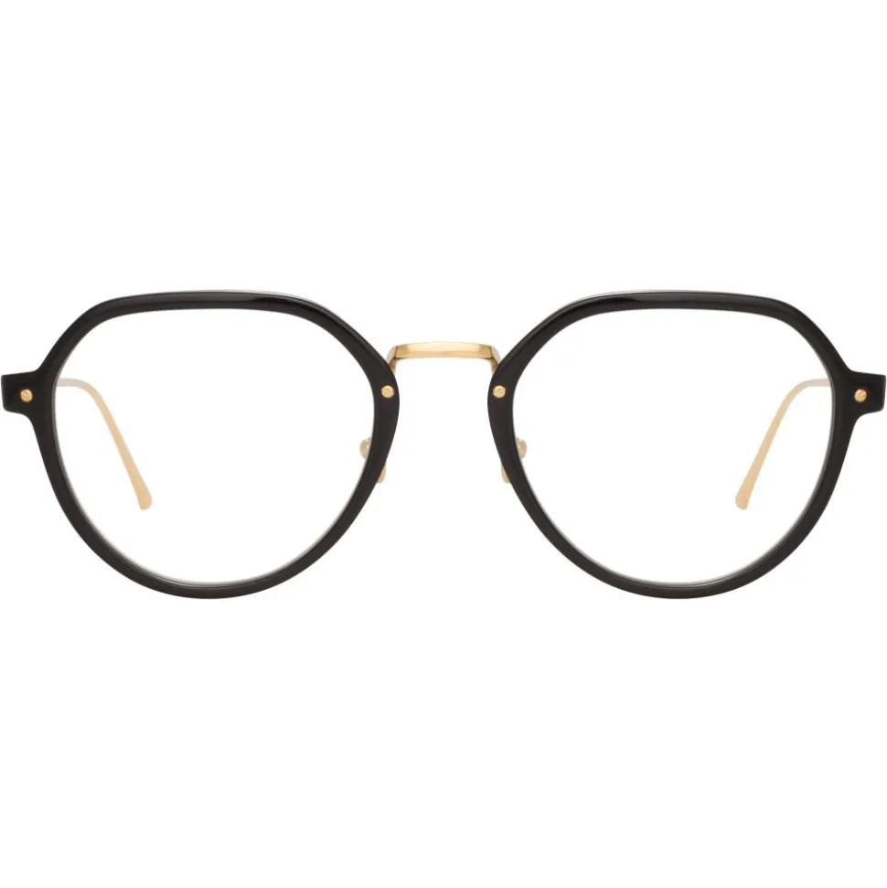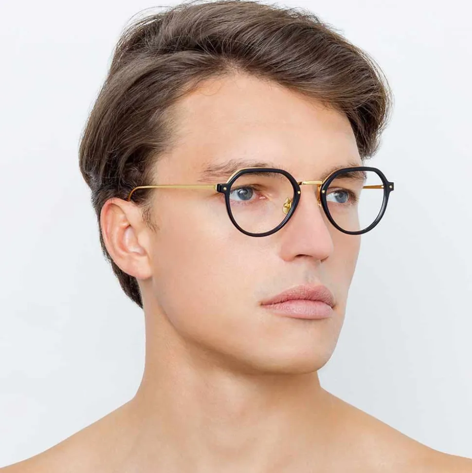 Reimagining a classic silhouette with luxurious details, these men’s Linda Farrow optical glasses pair black Italian acetate frames with 18-22 carat yellow gold-plated hypoallergenic titanium, running across the top half of the back of the frame into slim, tapered temples. They are hand finished with signature details including raised pins and the Linda Farrow logo.