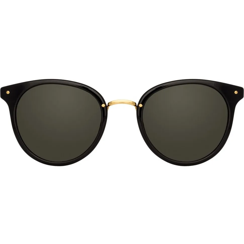 Capturing the good life of the jet set, these timeless, luxurious Linda Farrow sunglasses take inspiration from the work of Slim Aarons. In a unisex oval silhouette, black Italian acetate frames are accented with 18-22 carat yellow gold-plated hypoallergenic titanium running across the top half of the back of the frame and into slim, tapered temples. Paired with dark grey solid nylon lenses, they are hand finished with signature details including raised pins and the Linda Farrow logo.