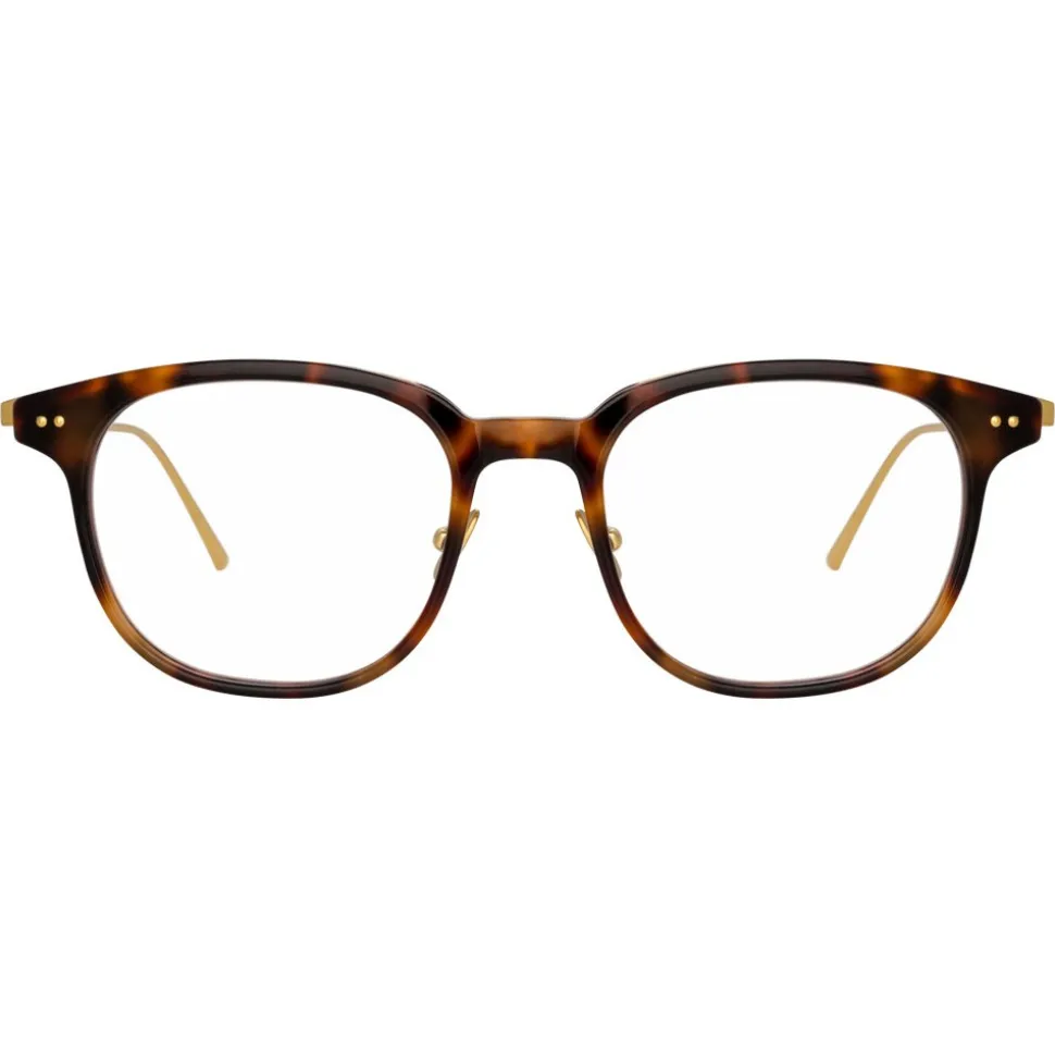 Pairing classic silhouettes with unexpected, luxurious details, these unisex Linda Farrow optical glasses are crafted with tortoiseshell Italian acetate and 18-22 carat yellow gold-plated hypoallergenic titanium, which runs inset the top half of the frame and into slim, tapered temples. Finished by hand, they are complete with signature details including raised pins and the Linda Farrow logo.