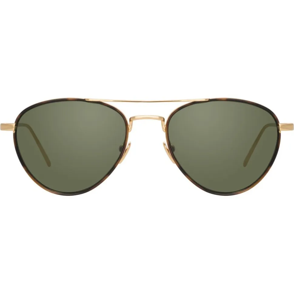 In an oval aviator silhouette, these luxurious men’s Linda Farrow aviator sunglasses take inspiration from the high life of the jet set captured by Slim Aarons. Crafted from 18-22 carat yellow gold-plated hypoallergenic lightweight titanium, they feature tortoiseshell Italian acetate inner windsor rims which hug the contrasting dark green nylon lenses and a feature top bar.