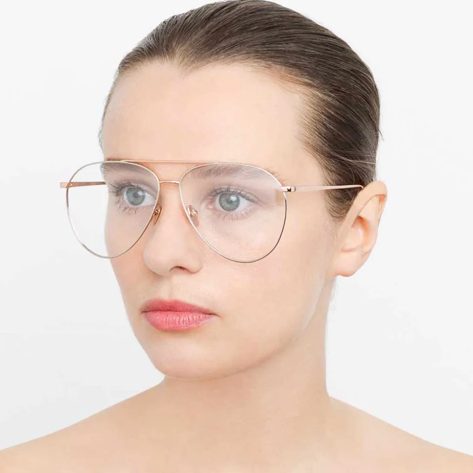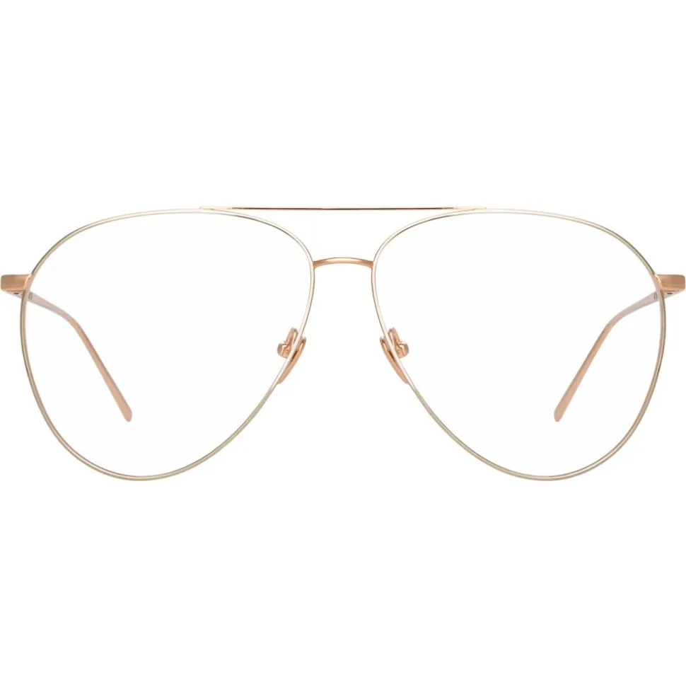 Elevating the aviator silhouette with unexpected details, these unisex Linda Farrow optical glasses are handcrafted from 18-22 carat rose gold-plated hypoallergenic titanium. Accented with 18-22 carat white gold-plated hypoallergenic titanium to the rims, these optical glasses feature a raised curved nose bridge and flat top bar. Signature finishes include tapered temples complete with the Linda Farrow logo and adjustable nose pads for superior comfort.
