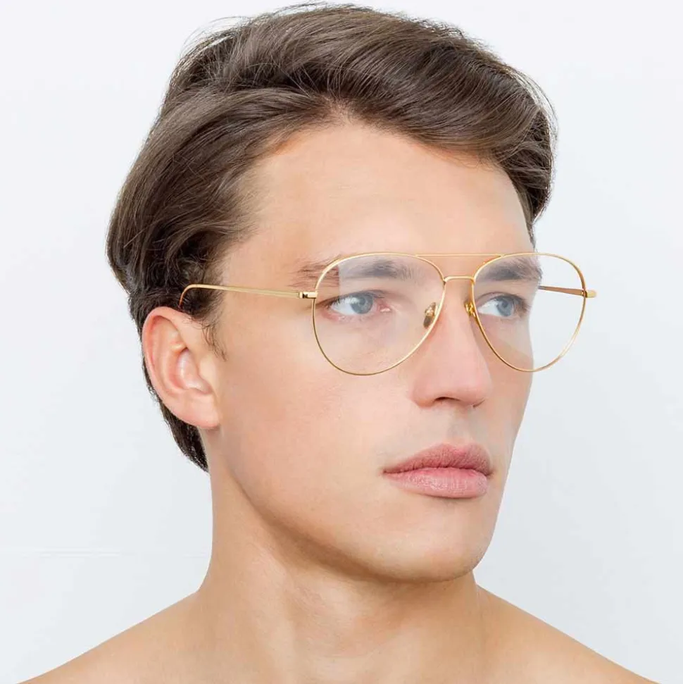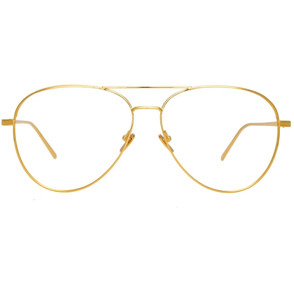 Reimagining the classic aviator silhouette in pure 18-22 carat yellow gold-plated hypoallergenic titanium, these luxurious unisex Linda Farrow optical glasses imbue timeless elegance. Finished by hand, they feature a double nose bridge and slim, lightweight temples finished with the Linda Farrow logo, tapered for superior fit. Adjustable nose pads provide superior comfort.