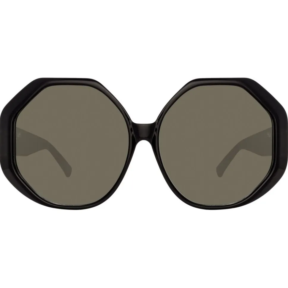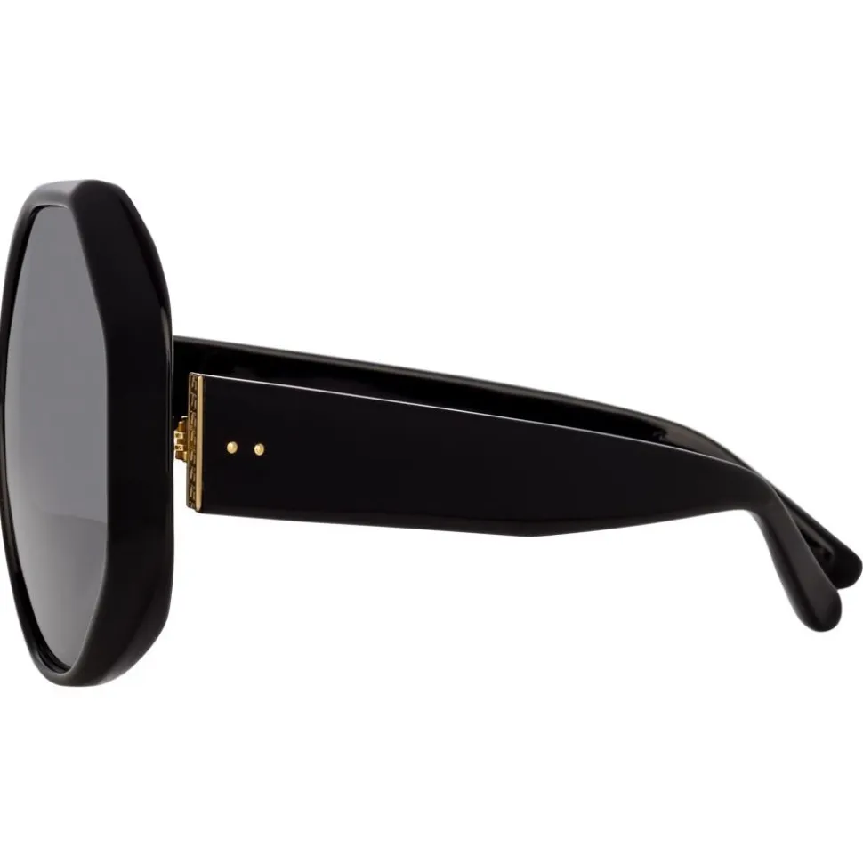 Encapsulating a world of exotic beauty, these bold oversized Linda Farrow sunglasses are hand-crafted from black Italian acetate. Beveled and hand-polished to achieve a luxurious shine and complete with signature yellow gold Linda Farrow detailing, they evoke warm winter getaways.