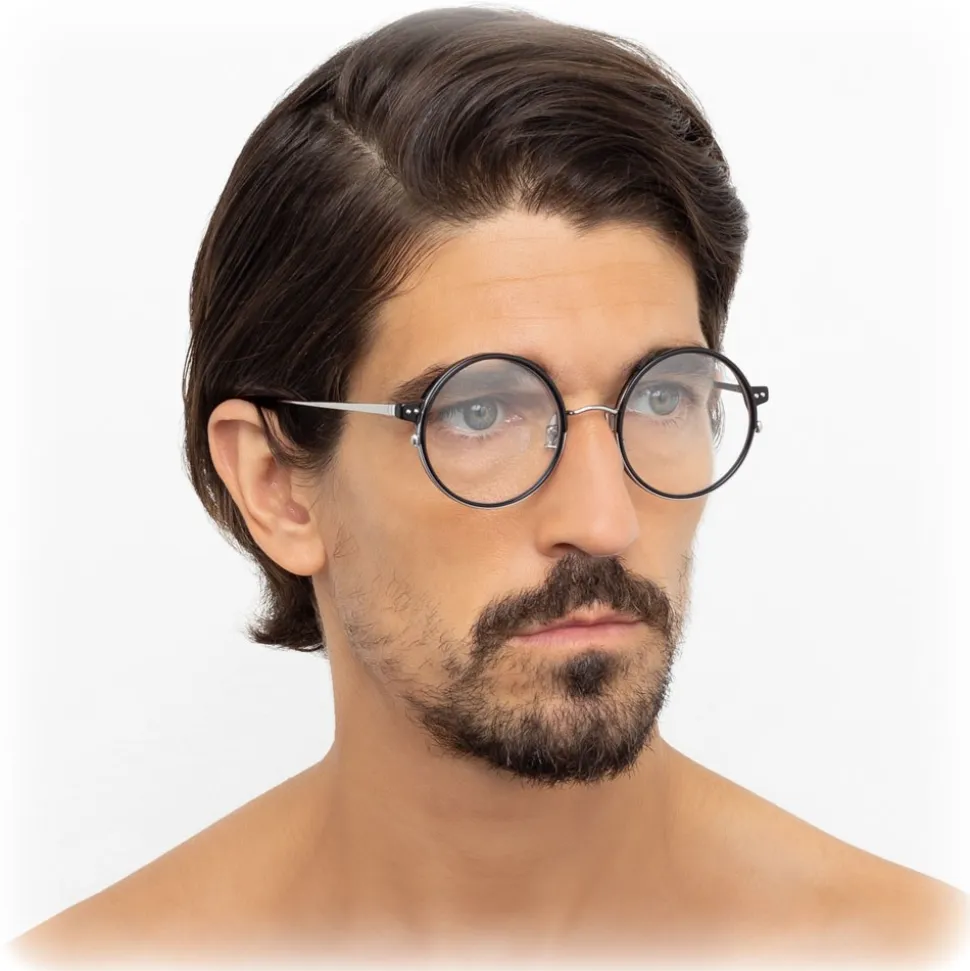 Crafted from white gold-plated titanium, these classic men’s round Linda Farrow optical glasses exude a sense of subtle luxury that comes with such refined detailing. A black acetate inner Windsor rim profiles the lenses, accentuated with a coordinating lip to the top half of the frame to create a contrast of proportions.