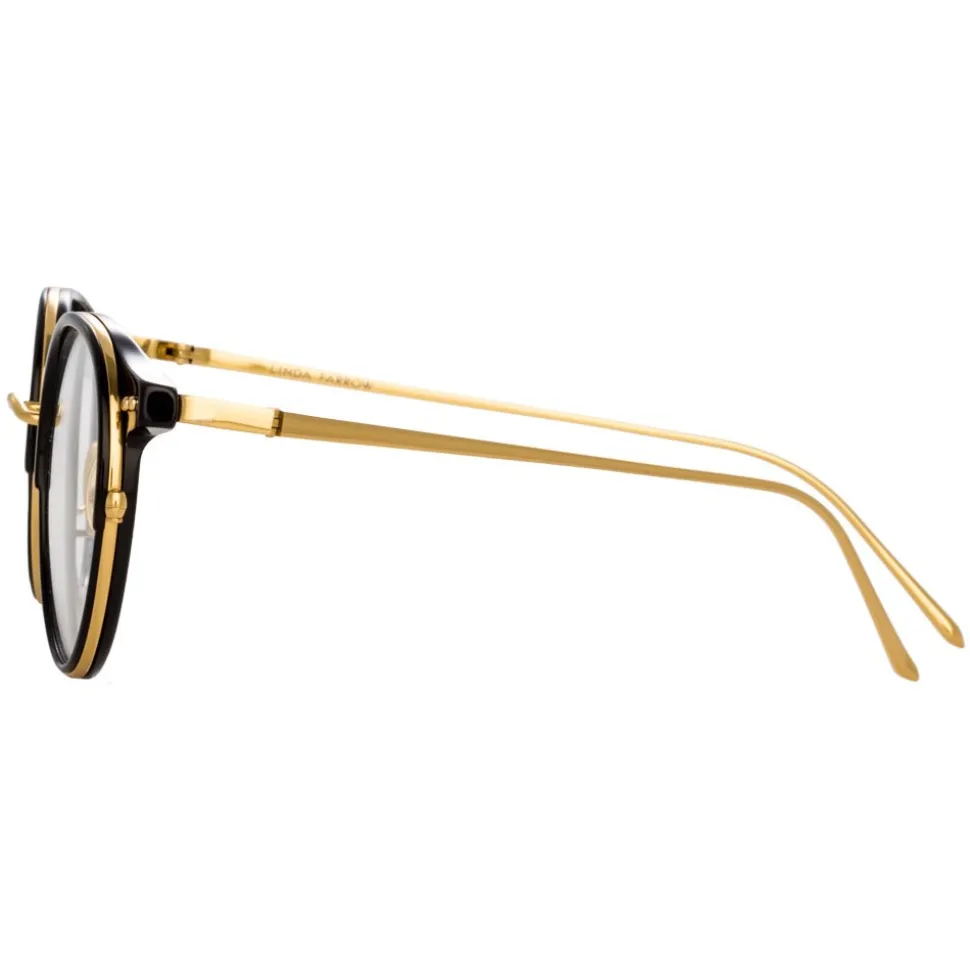 In a timeless oval silhouette, these men’s Linda Farrow optical glasses exude a sense of subtle luxury. Crafted from yellow gold-plated ultra lightweight titanium and black Italian acetate, the inner Windsor rim profiles the lenses, accentuated with a coordinating lip which creates a juxtaposition with the yellow gold rim.