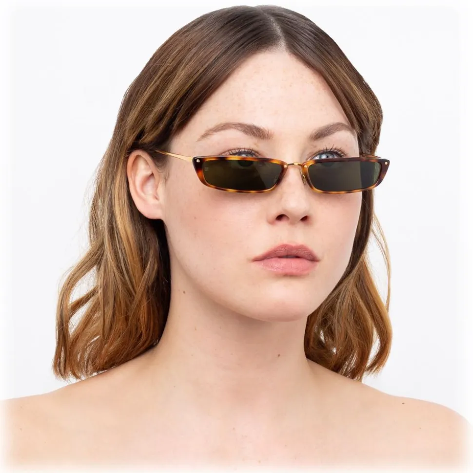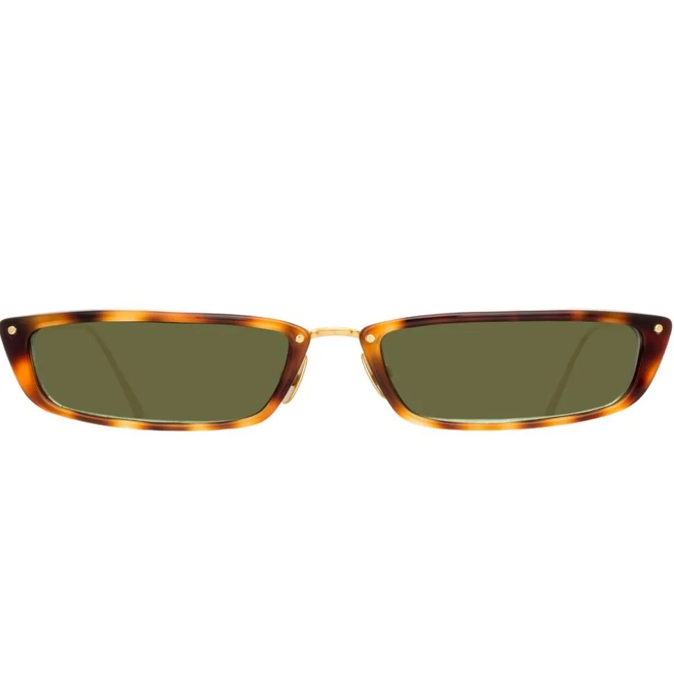 The silhouette for the season, these super skinny 838 Linda Farrow sunglasses pair rich, high shine tortoiseshell Italian acetate with ultra streamlined yellow gold-plated titanium, running across the back of the frame and through the temples.