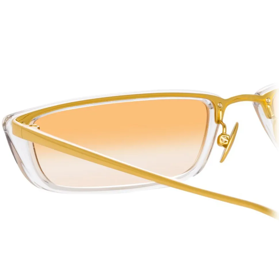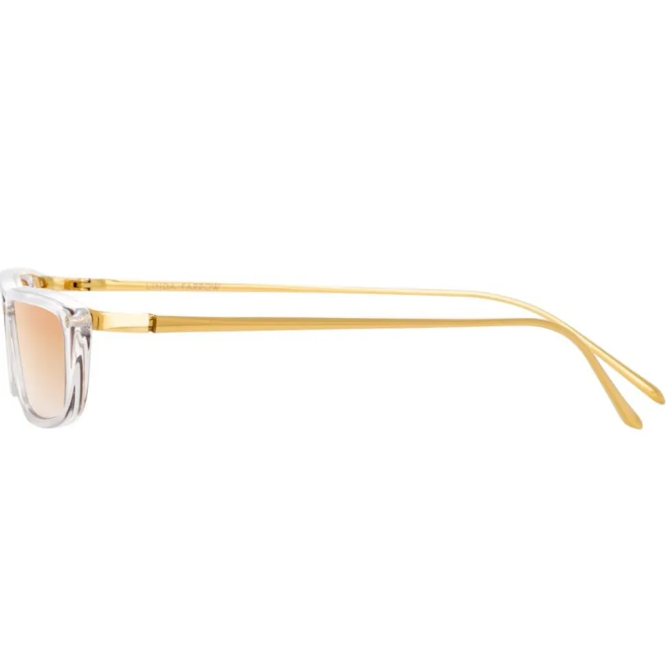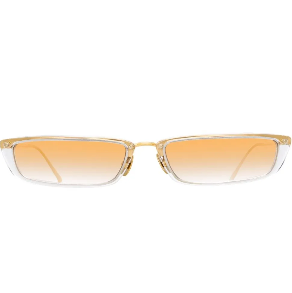 The silhouette for the season, these super skinny 838 Linda Farrow sunglasses pair rich, high shine translucent Italian acetate with ultra streamlined light gold-plated titanium, running across the back of the frame and through the temples. Dusky tan lenses complete this effortlessly elegant frame.
