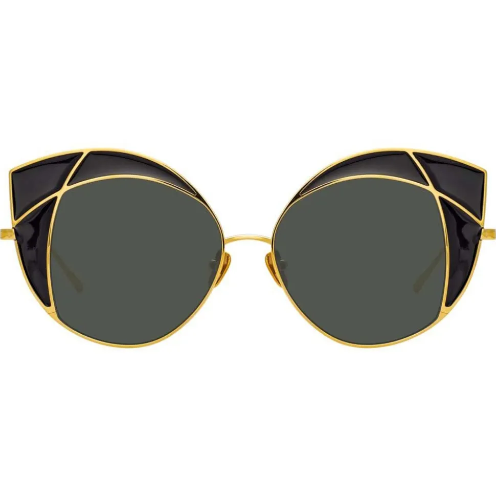 A fusion of vivid, warm hues and rich textures inspired by oriental cities, these winged cat eye Linda Farrow sunglasses pair yellow gold-plated titanium frames with dark grey lenses. The corners are accented with translucent black ‘stained glass’, evoking a feeling of understated luxury.