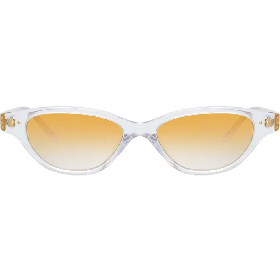 In a skinny cat eye silhouette, these Linda Farrow sunglasses bring glamorous yet contemporary appeal. Clear Italian acetate frames are paired with tan gradient lenses, evoking a sense of warmth and luxury. Signature raised pins in light gold complete this standout Linda Farrow style.