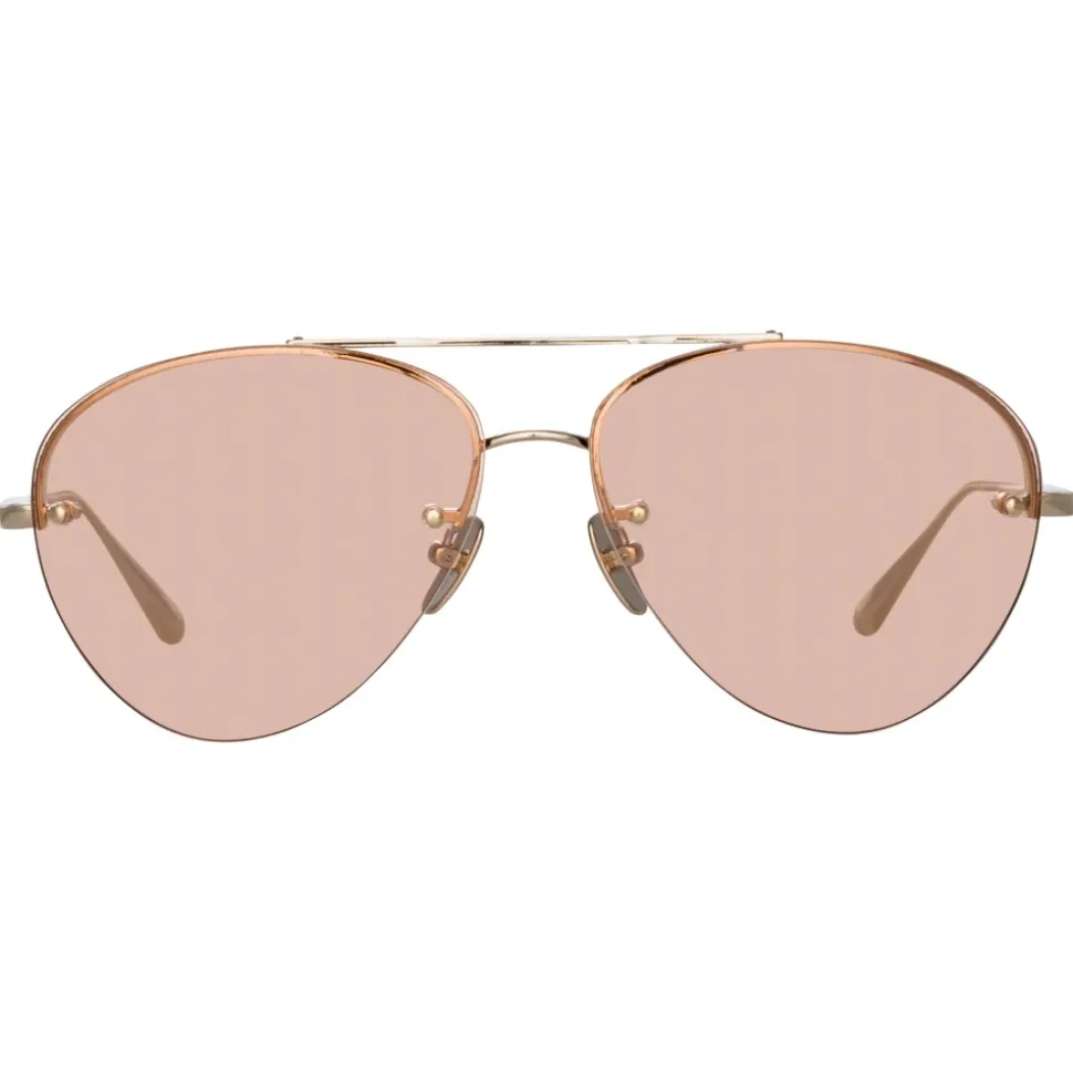Introducing Edano. Luxurious aviator sunglasses from Linda Farrow featuring peach nylon lenses, contoured by Japanese titanium top bar with a light gold colour plating, inner rim and nose bridge.