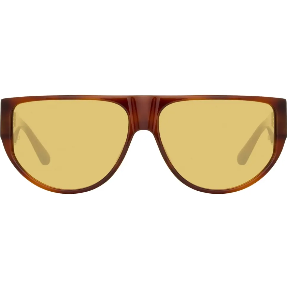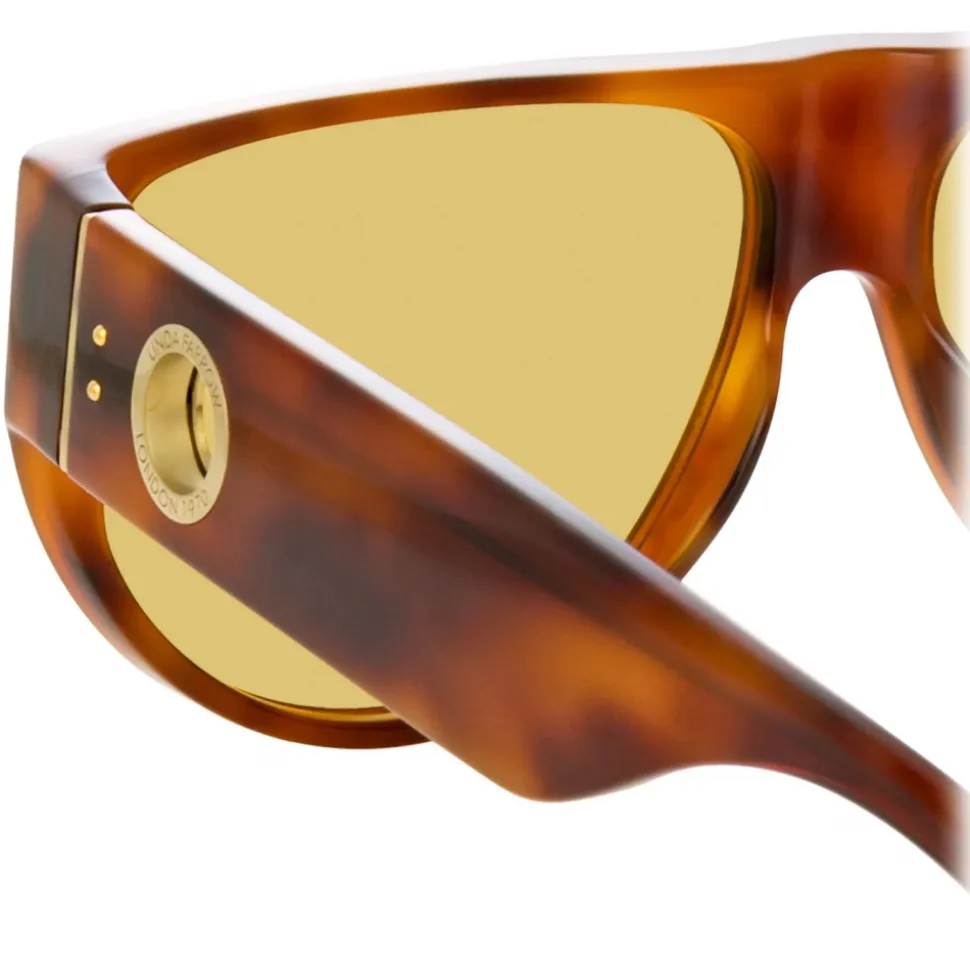 Formed from amber horn acetate these sculpted sunglasses from the LINDA FARROW collection are hand polished for a glossy finish. The flat top style features a gold plated titanium eyelet set into the temple monogrammed with ‘London 1970’ to mark the founding of the brand.