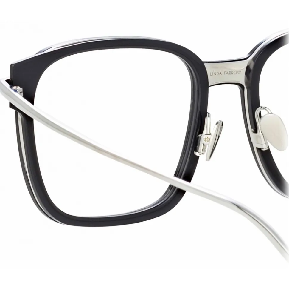 Intricately cut acetate and shiny sweeping metal work in harmony to create these oversized square optical frames from the LINDA FARROW collection. The finely polished recycled black acetate frame is intertwined with a delicate 22 carat white gold plated titanium framework, exposed at the bridge to reveal a subtle logo detail. Completed with adjustable nose pads and our signature tapered temples for a comfortable fit.