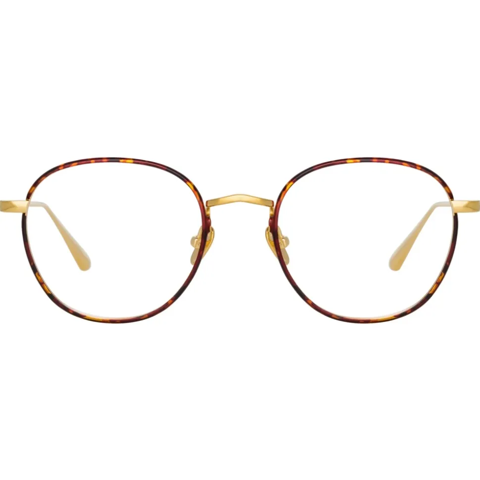Jules is crafted from pure 22 carat yellow gold plated Japanese titanium with contrasting foiled tortoise shell pattern rims. A discreet logo detail nose bridge gives way to adjustable nose pads for a tailored fit.