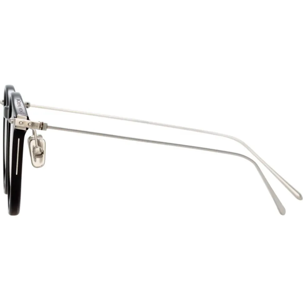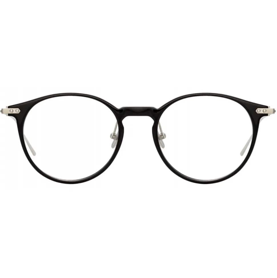 A timeless oval silhouette from the new Linda Farrow LINEAR collection, these unisex optical glasses pair black Italian acetate with ultra-thin 18-22 carat white gold-plated titanium. Engineered for unrivalled fit and comfort, innovative design details including white gold linear accents inset the frame, raised pins and a lasered logo complete this style for the ultimate in everyday luxury eyewear.