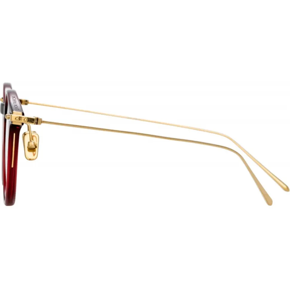 A timeless oval silhouette from the new Linda Farrow LINEAR collection, these unisex optical glasses pair burgundy Italian acetate with ultra-thin 18-22 carat light gold-plated titanium. Engineered for unrivalled fit and comfort, innovative design details including light gold linear accents inset the frame, raised pins and a lasered logo complete this style for the ultimate in everyday luxury eyewear.